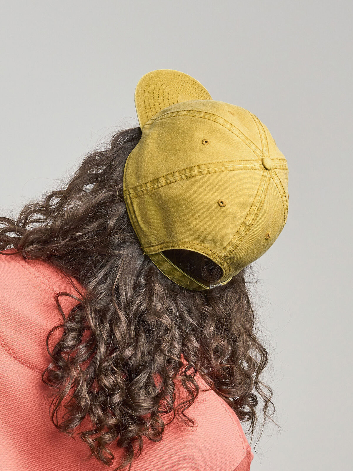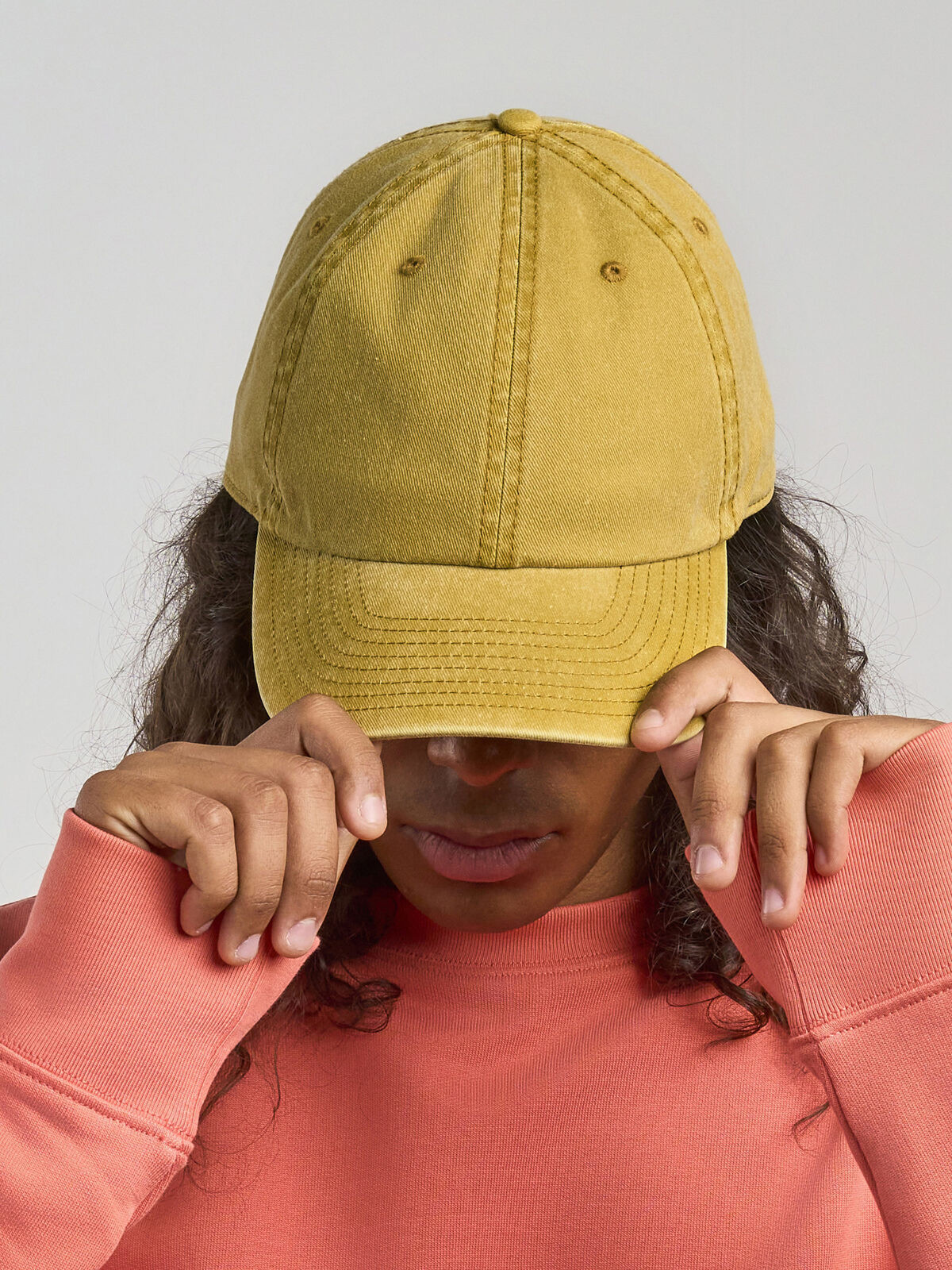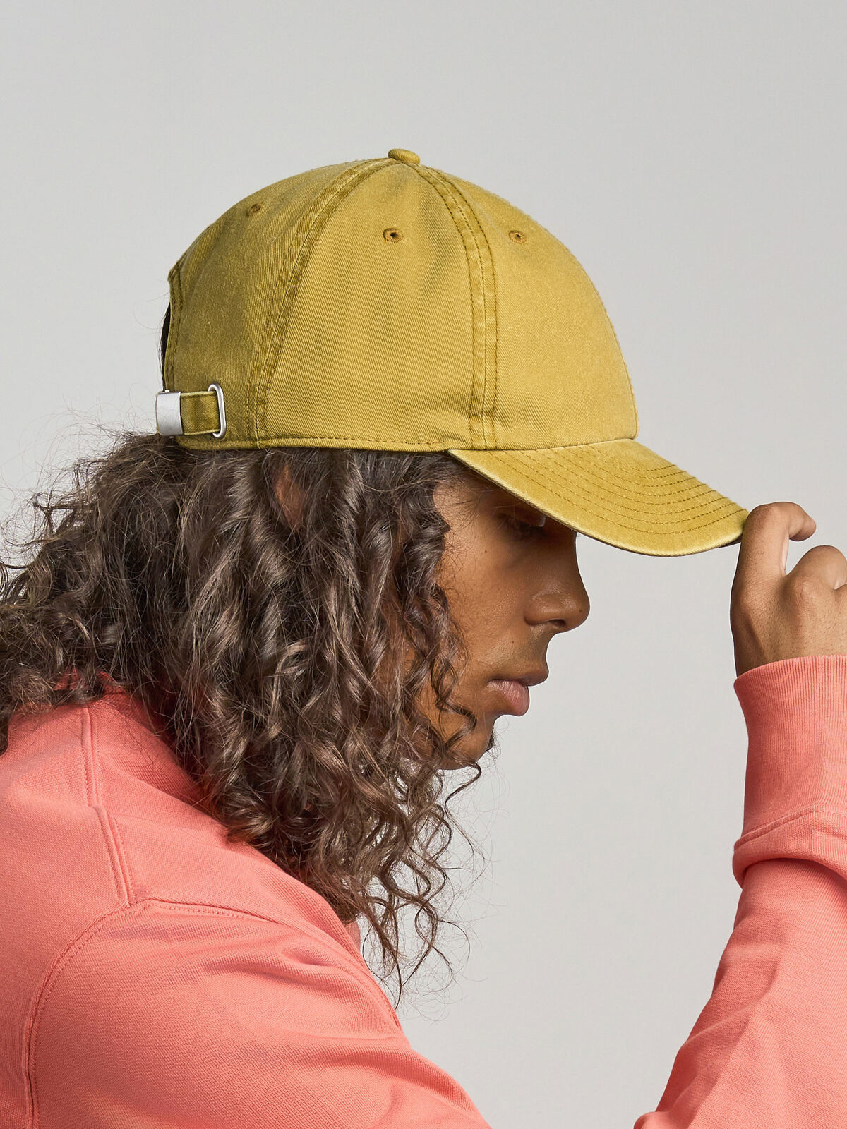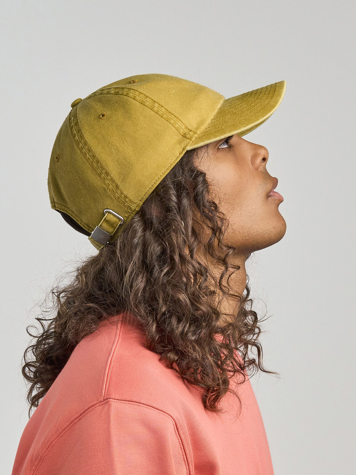 50% recycled cotton, 50% cotton. Deconstructed 6-panel hat, pigment dyed fabric, embroidered eyelets, recycled plastic visor interior, metal buckle closure.