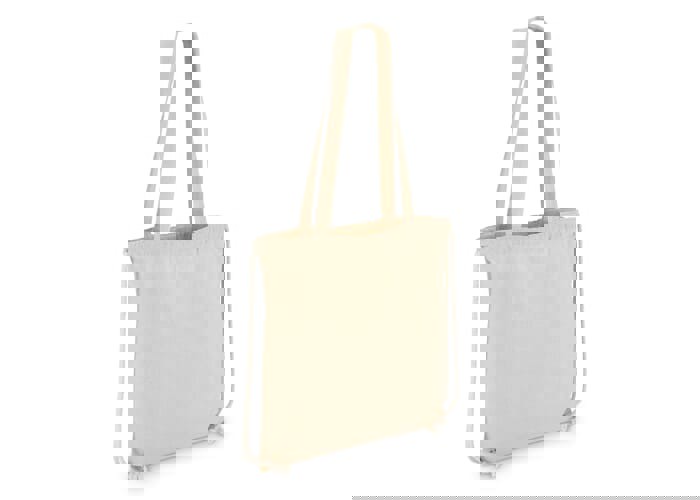 Classic 140gsm cotton tote with long handles and added drawcord closure for extra versatility. Can be carried as a standard tote or secured like a drawstring bag. Oeko-Tex® certified. Ideal for daily use, giveaways, or retail promotions.