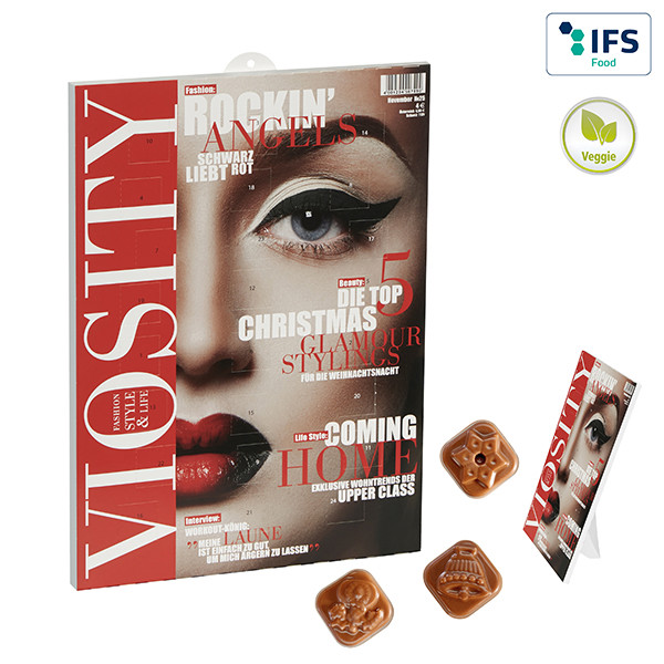 Table and wall Advent calendar in vertical or horizontal format, filled with milk chocolate, stable deep-drawn sections, 3 x glued, 24 doors. Minimum quantity per motif: 25,000 pieces. Milk chocolate, cocoa: 30 % minimum