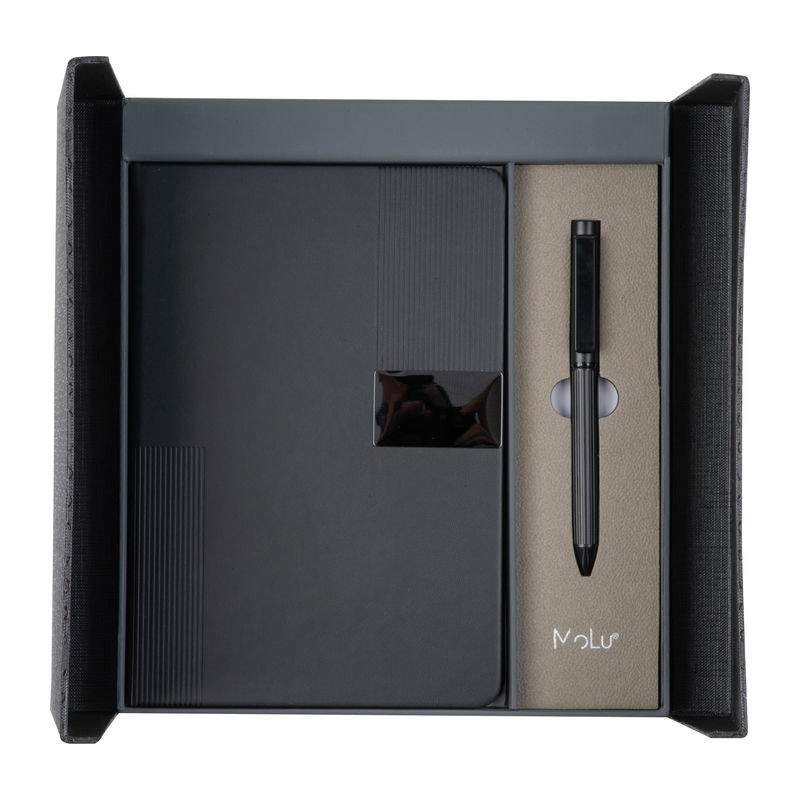 Priloženi kemični svinčnik s kovinskim gumbom z modrim črnilom dodaja dodatno udobje – vedno pripravljen za vašo naslednjo idejo. Z merami 210 x 145 x 12 mm in težo le 265 g je dovolj kompakten za sestanke ali uporabo na poti.