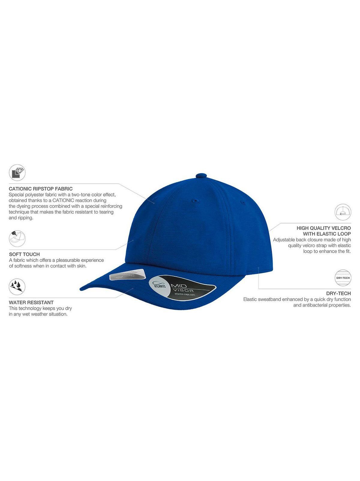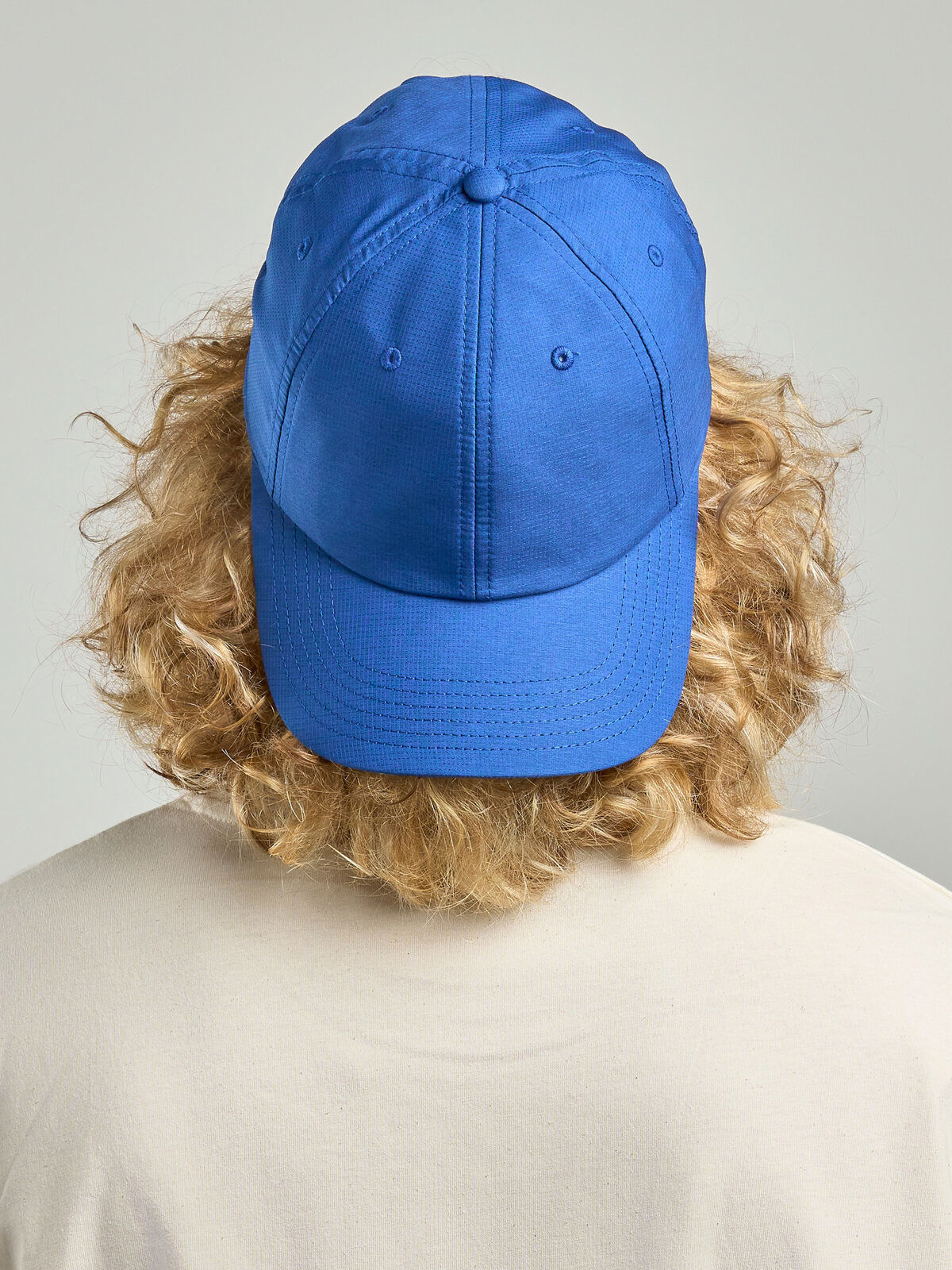 100% polyester. 6 panels, polyester, mid visor, unstructured baseball, stitched eyelets, high quality velcro closure, 6 stitchings on visor. Removable label.