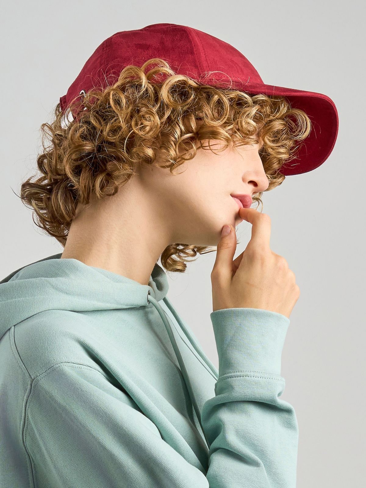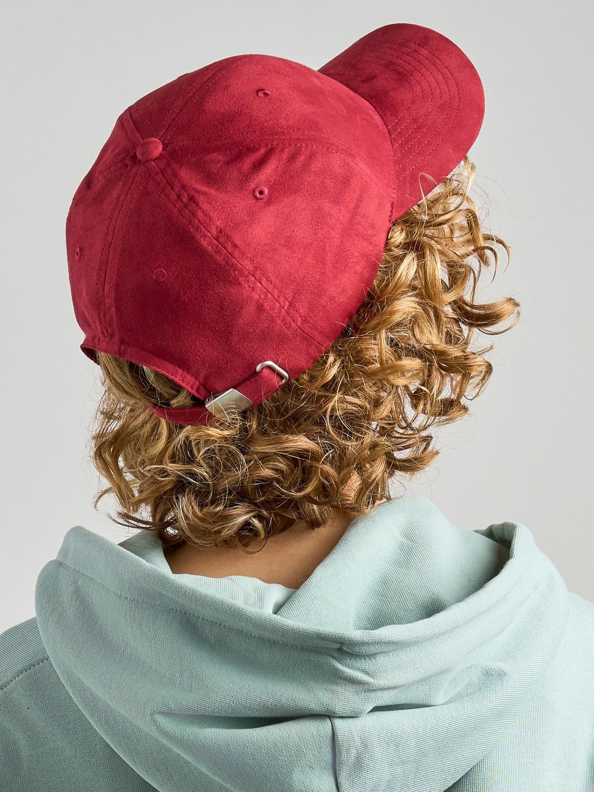 81% recycled polyester, 19% polyester. 6-panel hat with textured front panels, suede effect, recycled plastic visor interior, metal buckle closure.