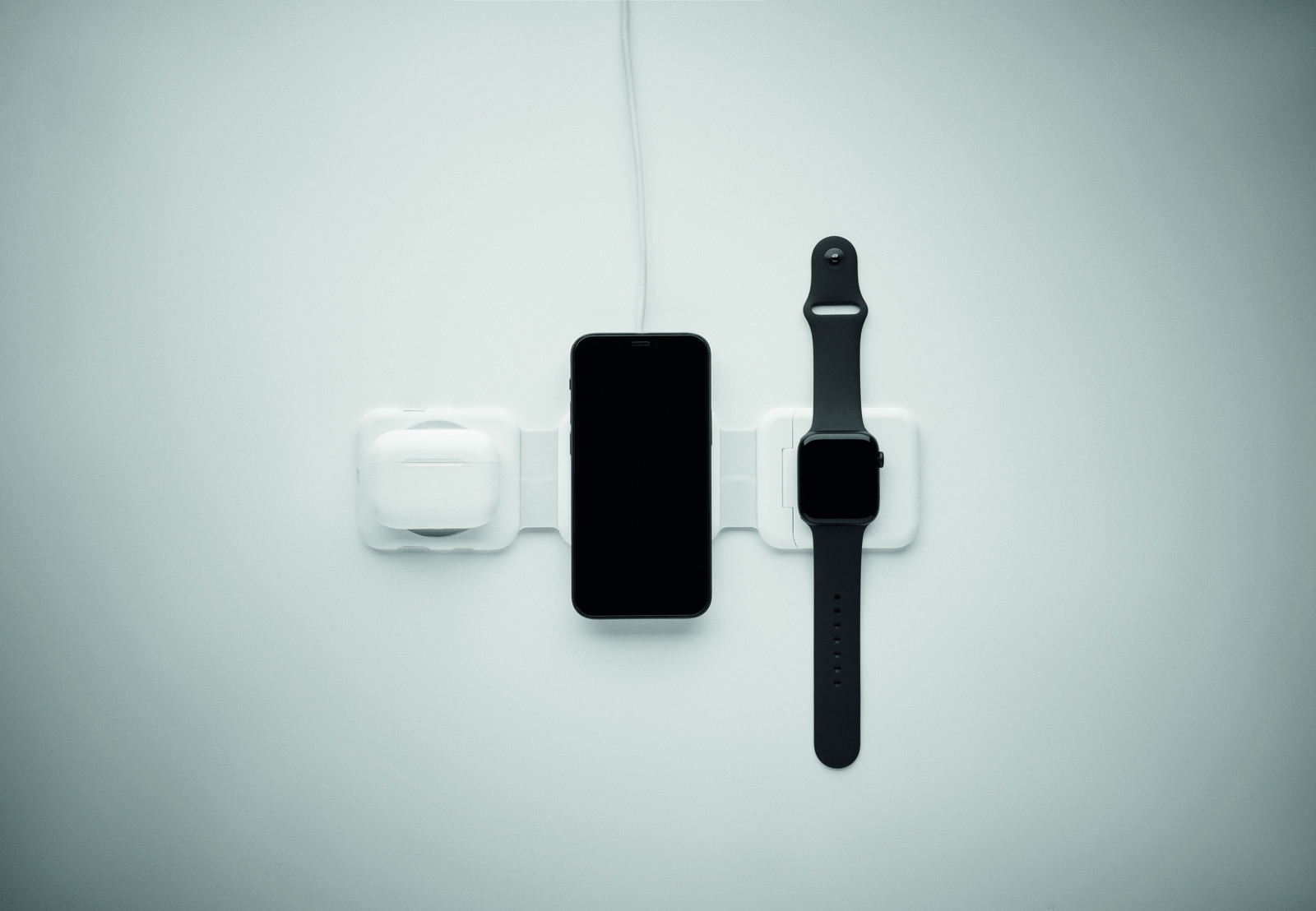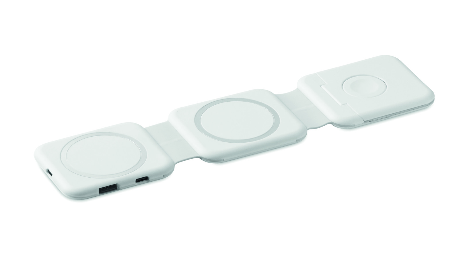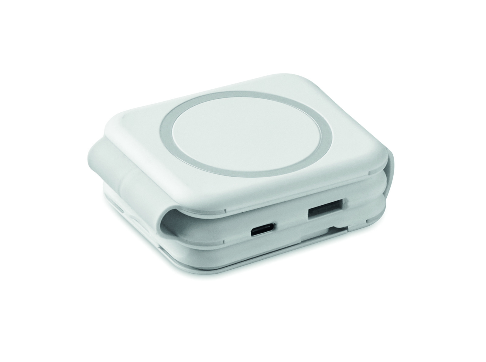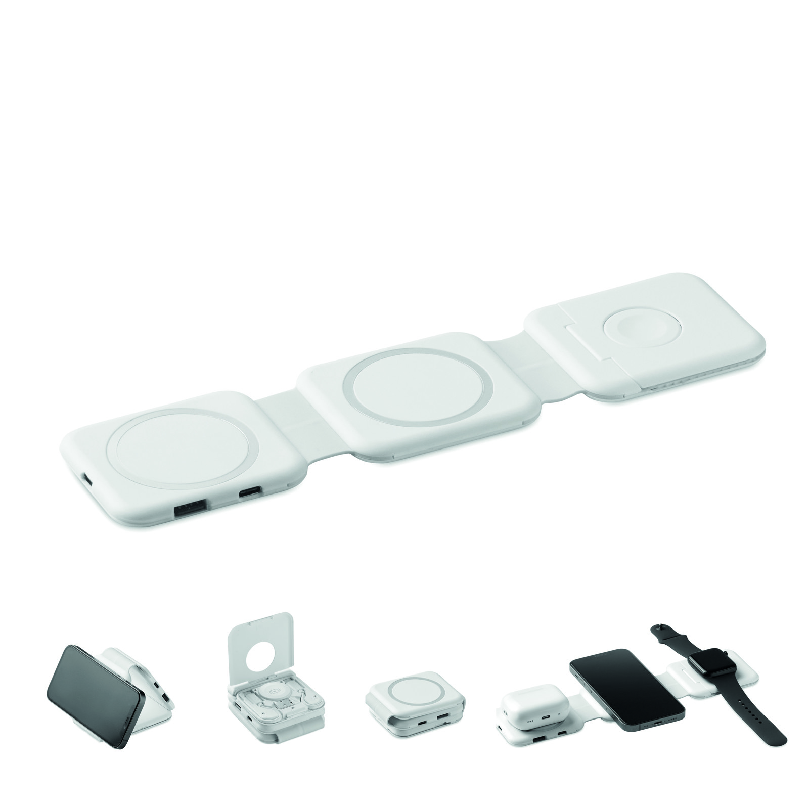 Magnetic charging station in ABS. 3 wireless charging spots. 1 x 15W, 1 x 5W for TWS and 1 Apple Watch charger (3W). 2 Type-C & 2 USB-A HUBS. Integrated cable input: connector from Type-C to USB-A.