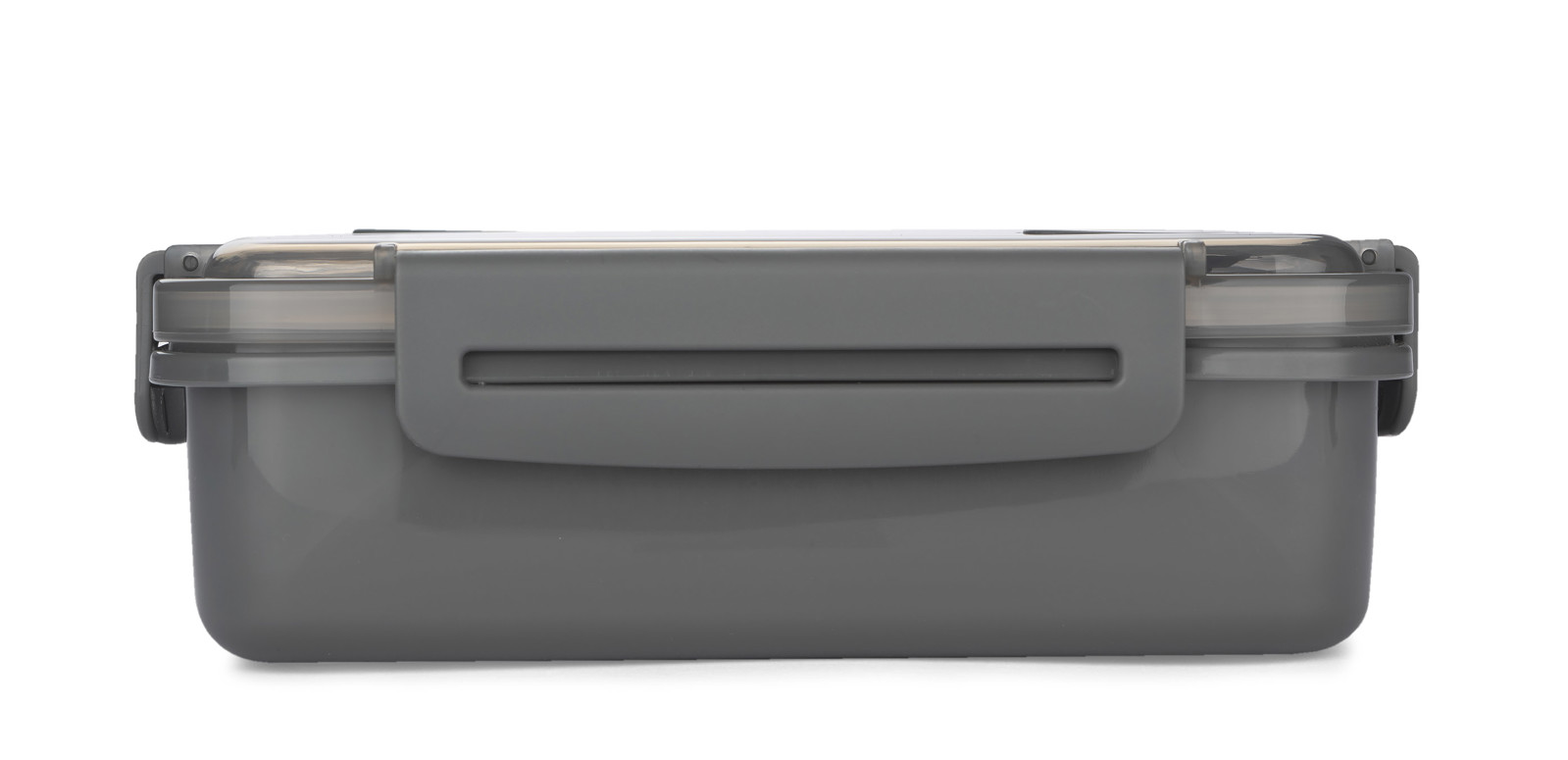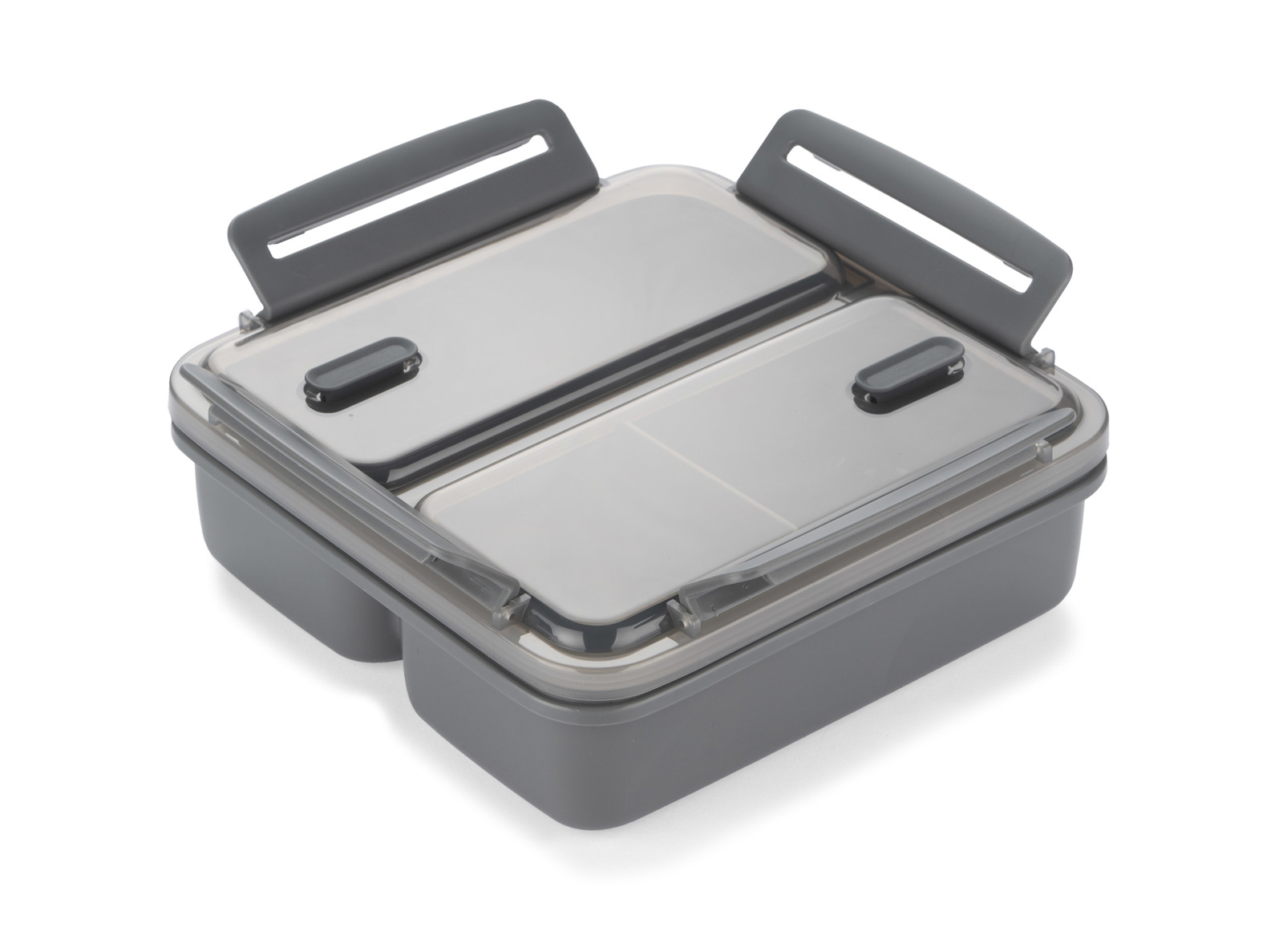The DUO lunch box has 2 main compartments and an additional removable separator. It has a seal in the lid. Closed with four latches. The capacity of the 1100 ml container will fit a large lunch. Made of polypropylene material safe in contact with food.
