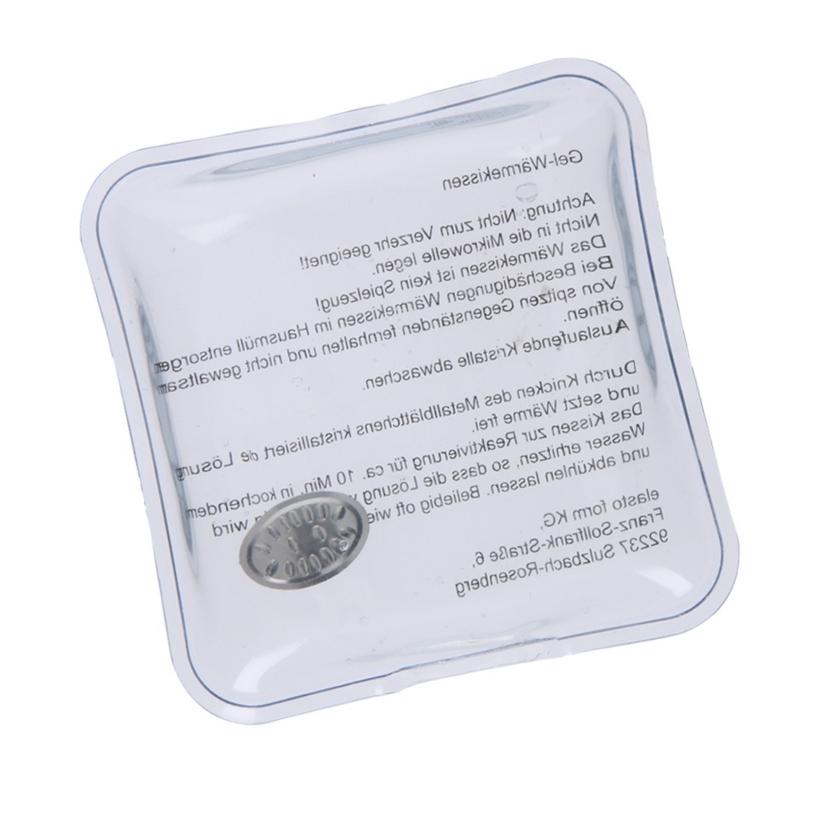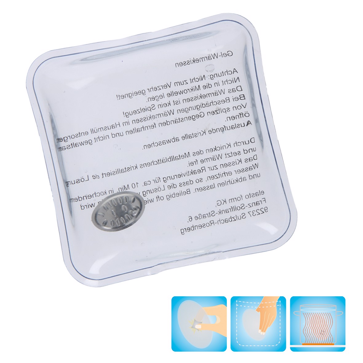 Provides approx. 15 minutes of optimum heat at up to 50°C due to crystallisation of the liquid content when the metal plate is folded. Recharge by placing in boiling for 10 minutes after use. Reusable up to 1000 times.
