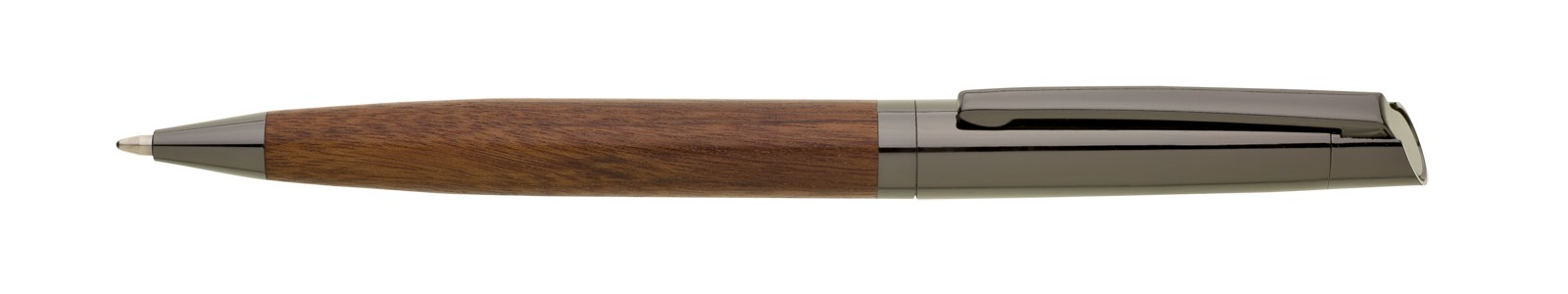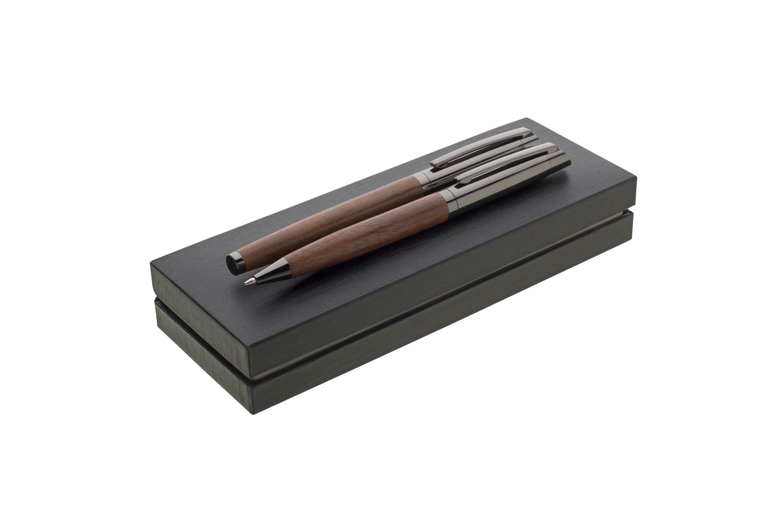 Elegant set with Genero ballpoint pen and roller made of wood and metal, with metallic accents in graphite color, presented in a gift box. Gabrielis collection.