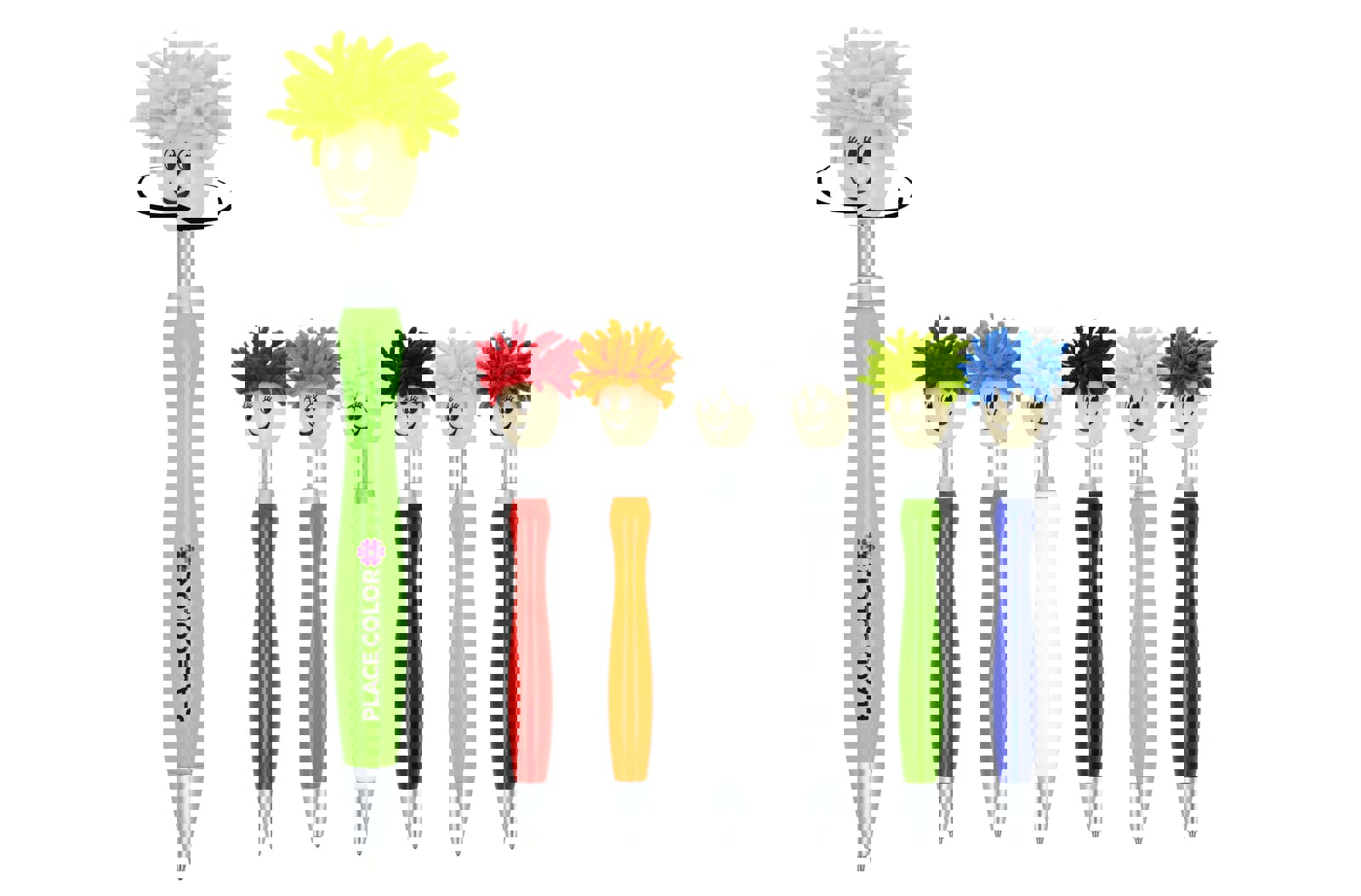 Playfull ball pen with a hairy spinner pusher. The ballpen comes with a blue writing refill.