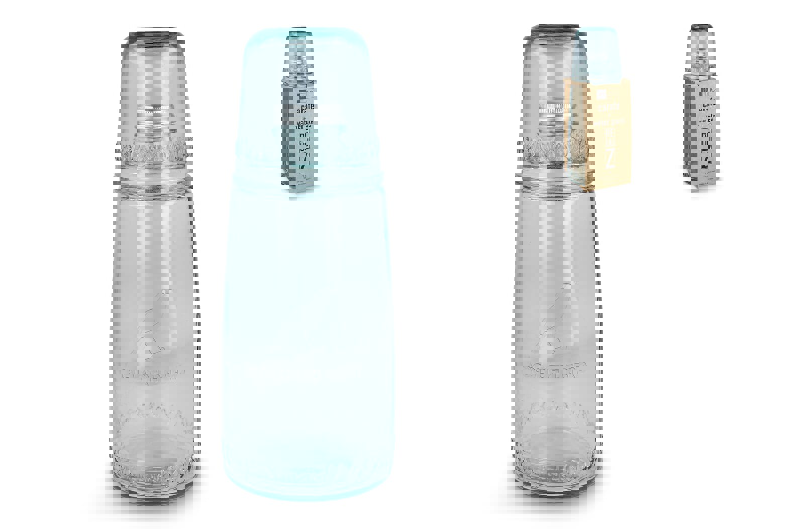 Discover the InSideOut ReuuZ 1-liter carafe with a metal cap and matching water glass that sits on top. Made in Europe from 100% post-consumer recycled glass, it highlights the unique character of recycled material. A responsible product with a simple, natural design, perfect for keeping your hydration on track at home or at work.