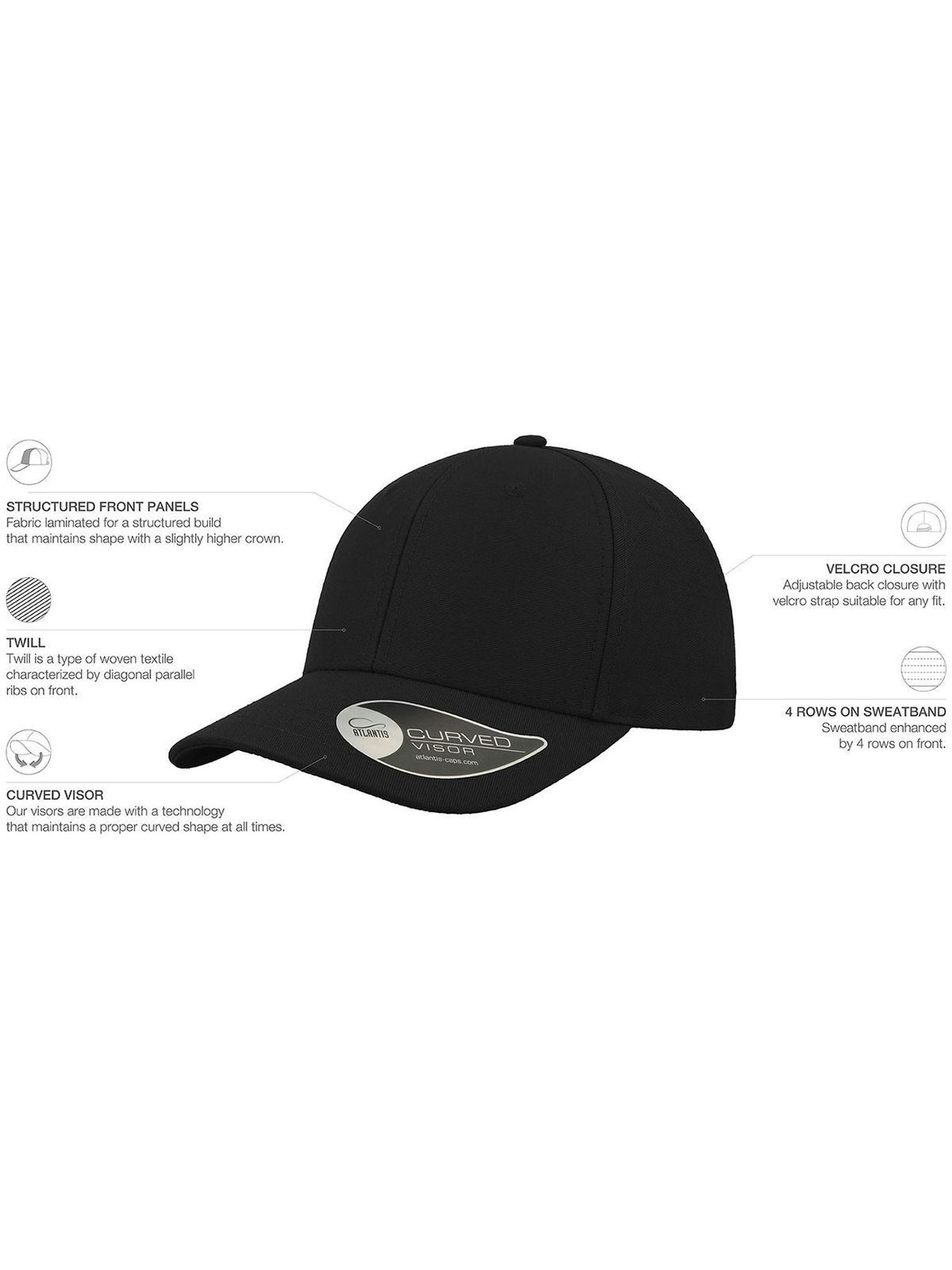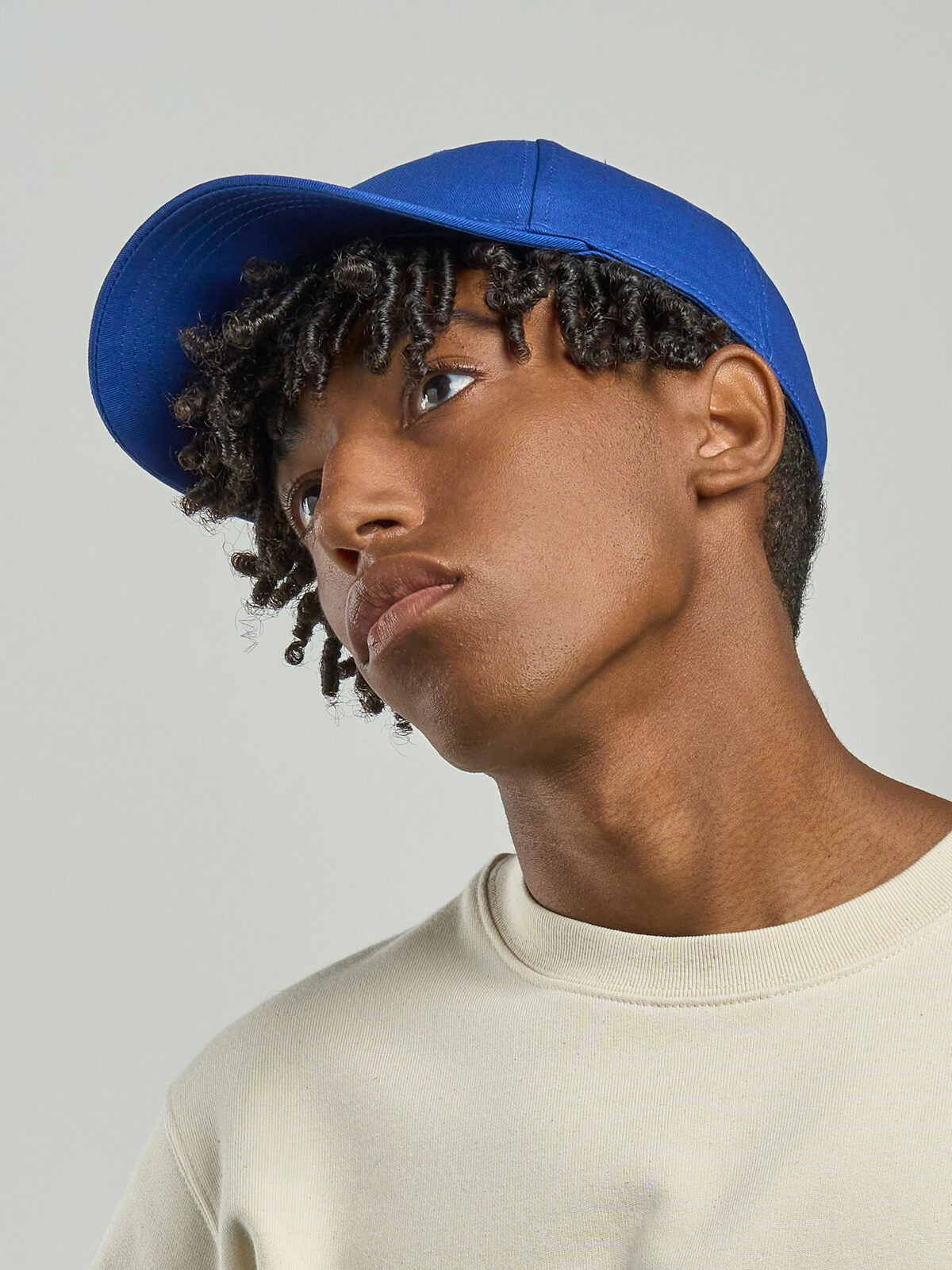 100% chino cotton. 6-panel cap with embroidered eyelets, reinforced front panel, and pre-curved visor. Velcro closure with 4 stitches on the visor and cotton sweatband. Removable label.