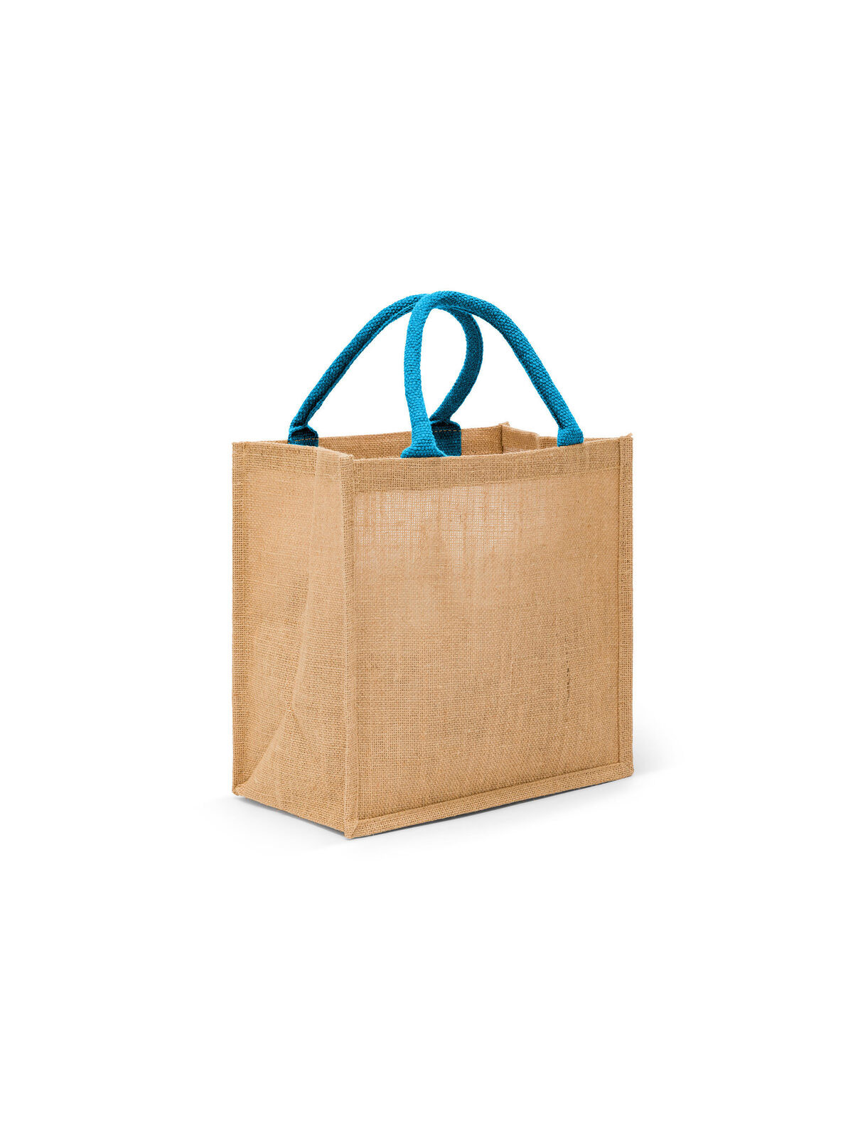 100% Jute. Bag with cotton handles. Handle length: 35 cm, dimensions: 26x22x14 cm, capacity: 6 liters, printable area: 18x14 cm.
