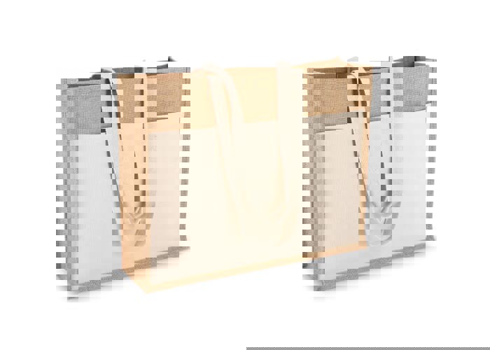 Sturdy jute bag with a cotton front pocket and matching cotton handles. Made from 320gsm material, offering durability for everyday use. Oeko-Tex® certified for tested, safe textiles. Ideal for shopping or a day at the beach.