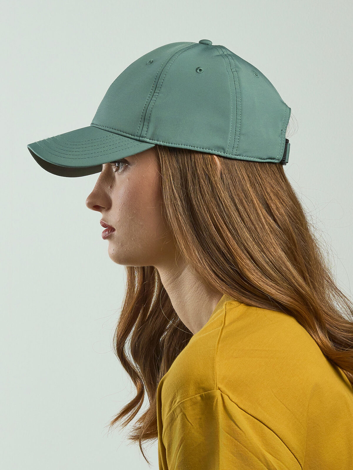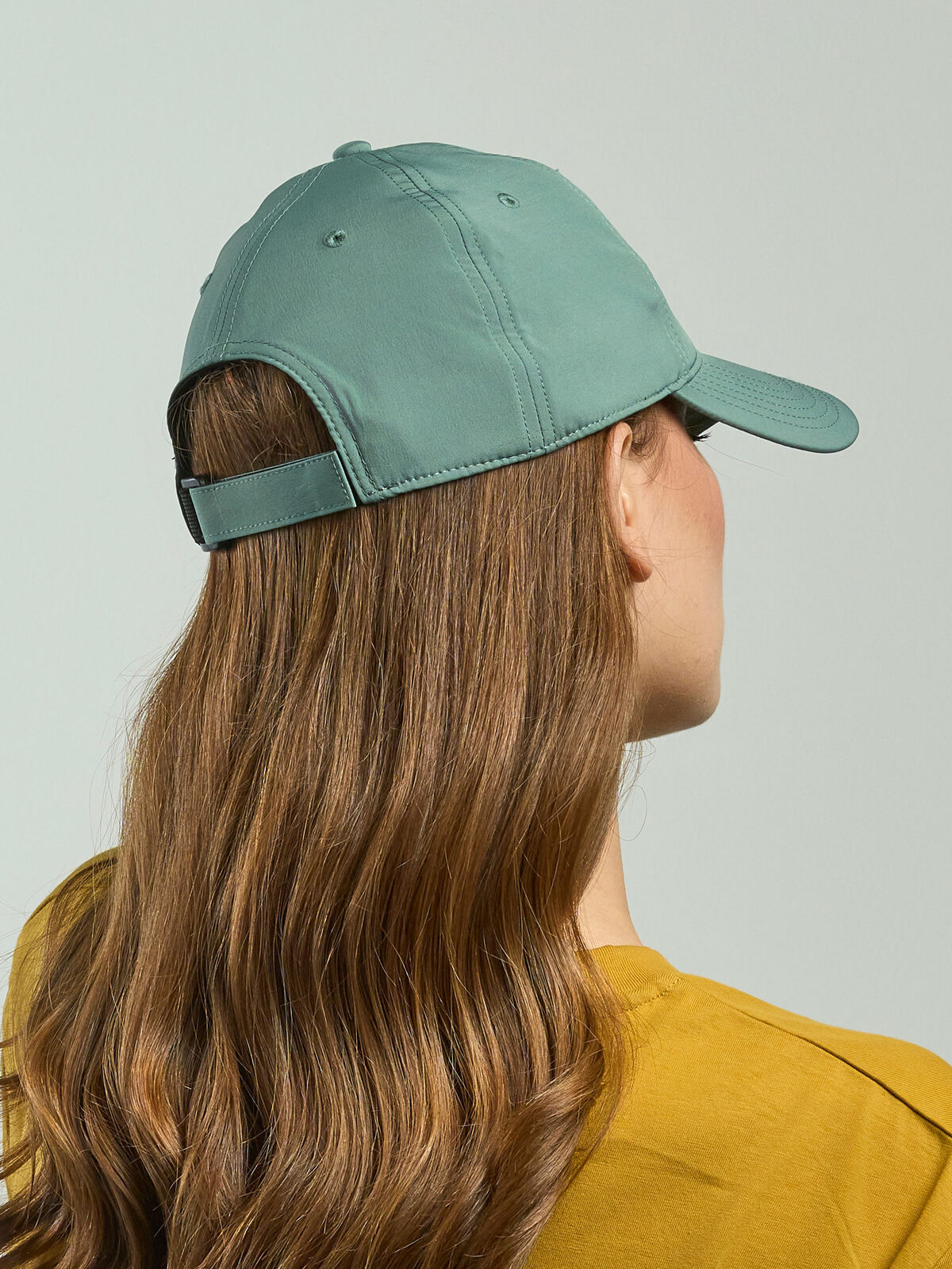 97% recycled polyester, 3% Elastane. All-around casual hat made of recycled polyester and elastane, six-panel, mid visor, waterproof and with HQ velcro and buckle closure. Removable label.