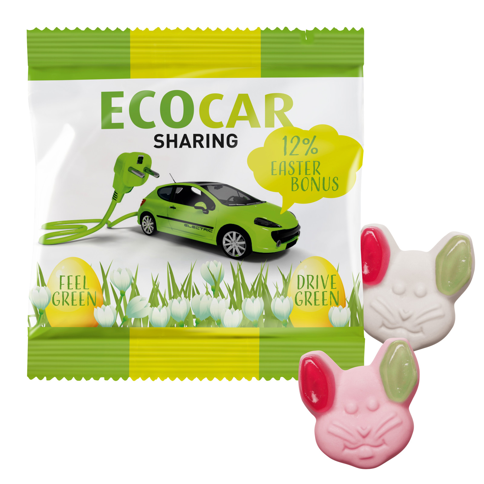 His name says it all. The green ear in strawberry flavour stands for delicious, vegan enjoyment and fits perfectly with the red ear with cassis flavour. The pink foam sugar rabbits taste like raspberry and the white ones like cherry. In a variety of flavours, all from natural flavours and colours and packed in a shiny or matt coated, transparent or white bag.
