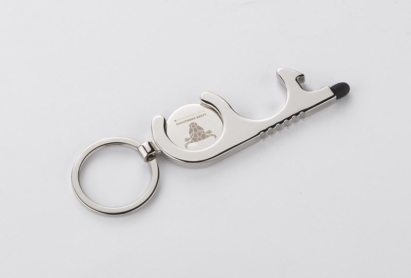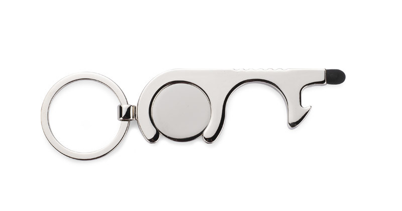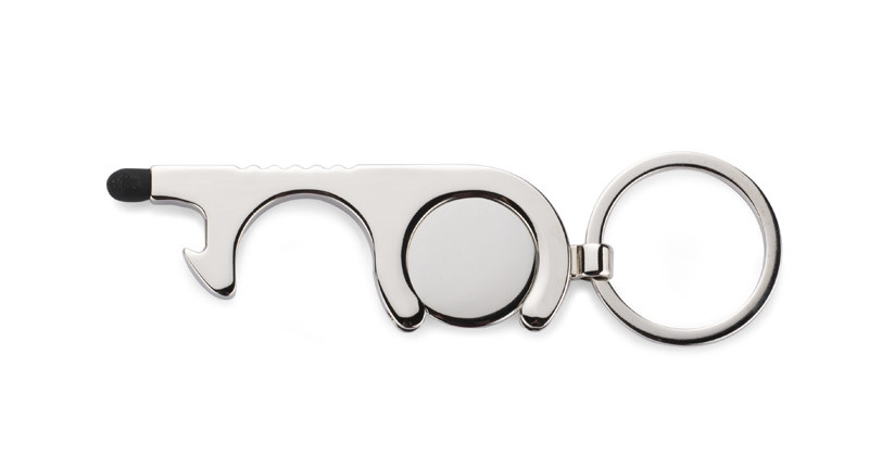 The anti-touch TUS key ring is a universal addition to the keys. With its help, you do not have to touch the handles or buttons directly, e.g. in an ATM. The key ring contains a coin for shopping carts and acts as a bottle opener. There is an elastic band fixed on the tip, so it can be easily used on touch screens. This is a useful gadget, especially during an epidemic. The key ring is packed in a brown paper envelope.