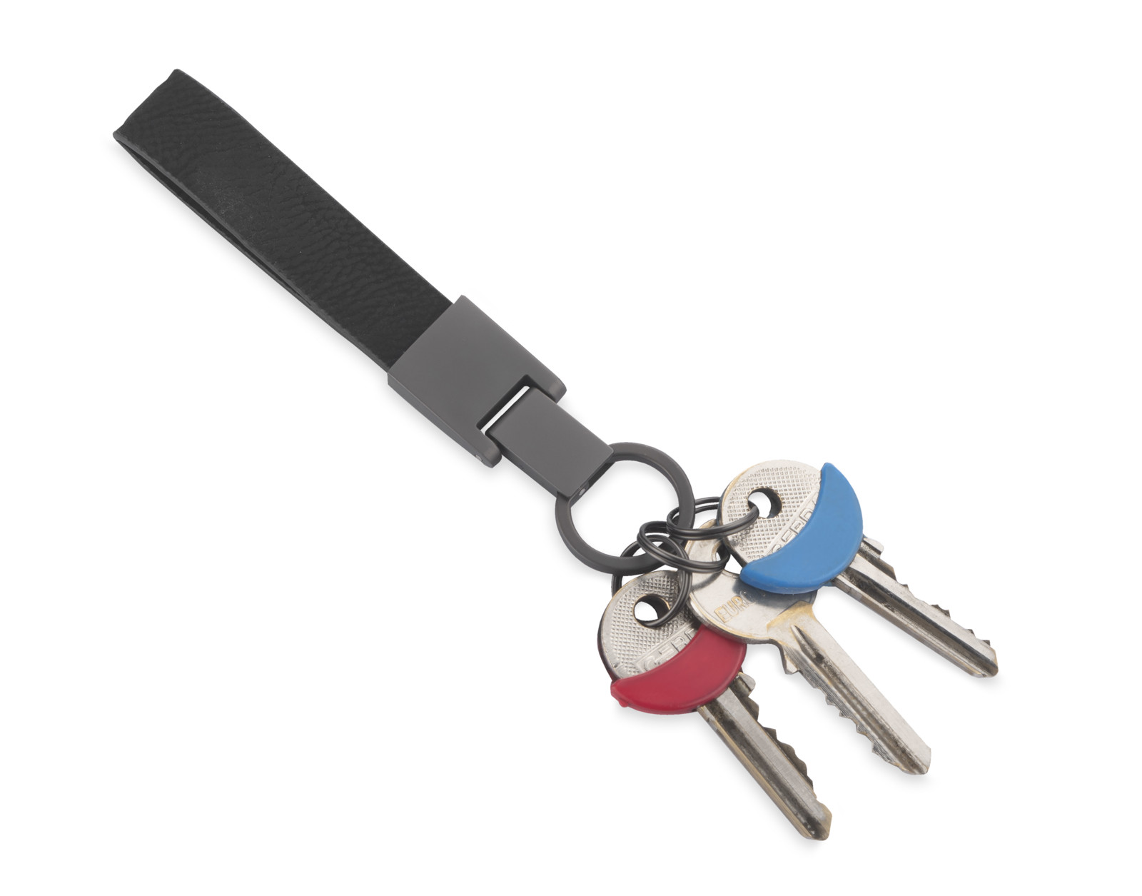The DERI keychain is an elegant promotional gadget made from high-quality eco-friendly leather with dark metal accents. Its minimalist design and three additional rings allow for easy organization of keys or attachment of accessories. It comes packaged in a stylish cardboard box, making it an ideal corporate gift.