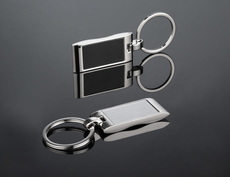 Metal keychain with rectangular, wavy pendant. Logo will be engraved on the surface of the pendant.