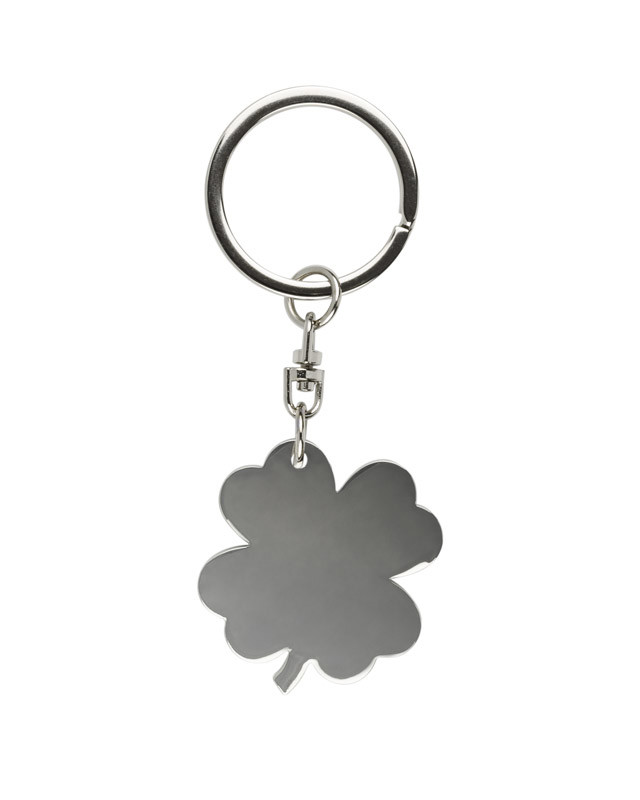 Four-leaf clover keychain will bring luck to every owner. Made of chrome-plated metal. Logo might be engraved on the clover.