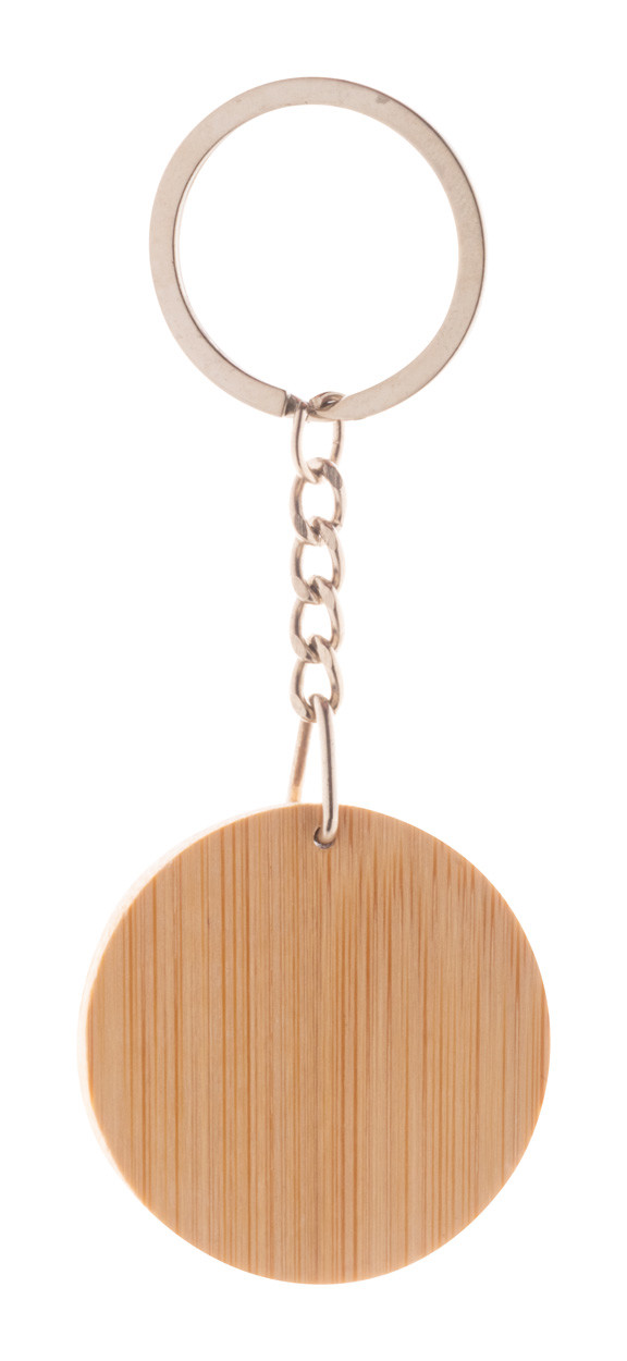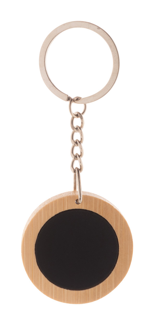 Bamboo keyring with rubberized finish stainless steel plate and metal ring. With special coating for mirror laser engraving.