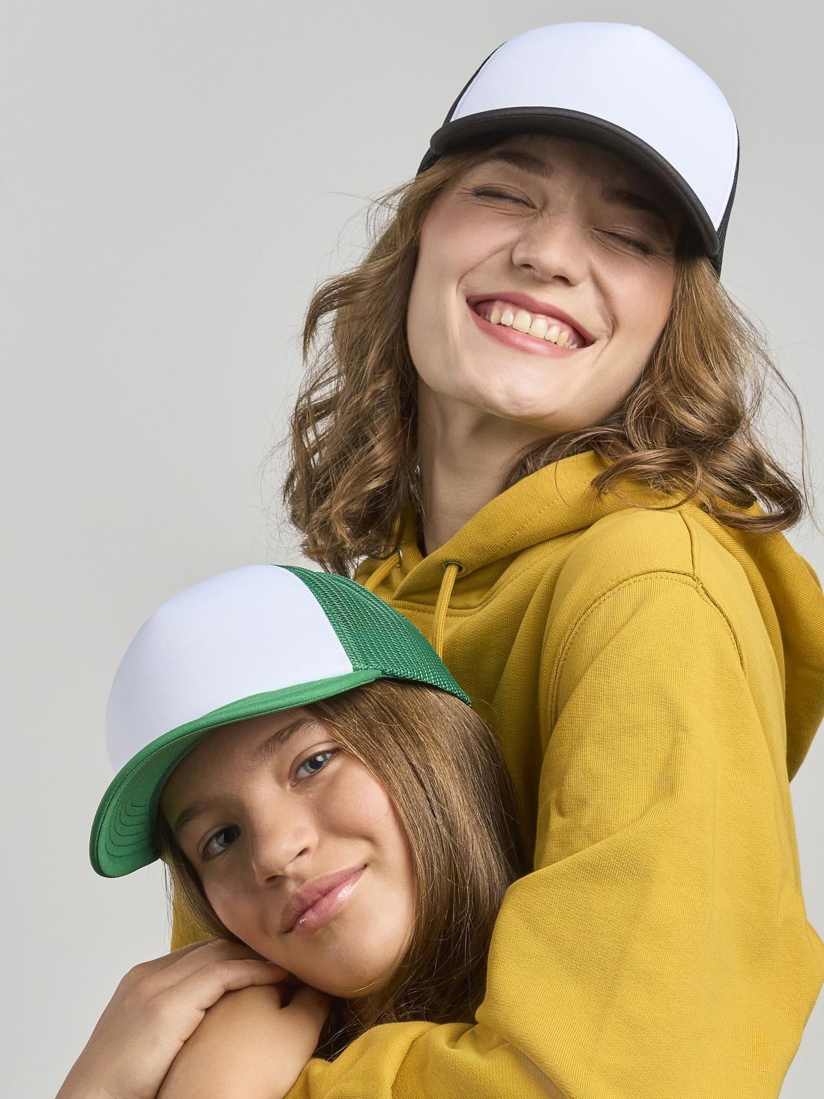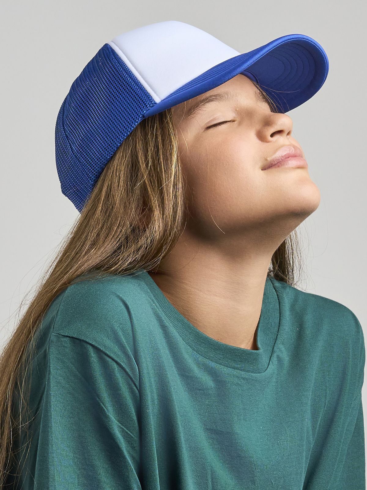 100% recycled polyester. Children's 5-panel hat with padded polyester front panel, side and back mesh, snap-back closure, recycled plastic visor interior.
