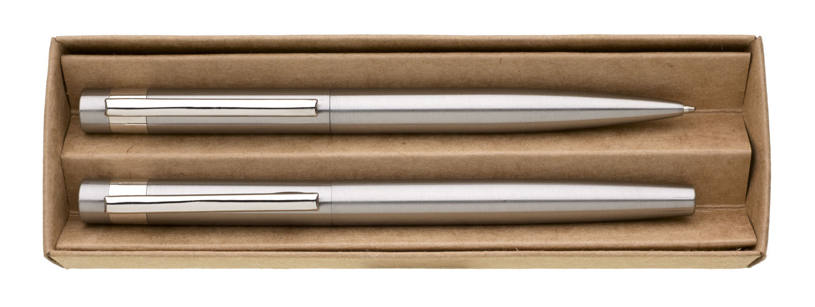 Naredite trajen vtis s kovinskim kompletom Reatino – prefinjeno in okolju prijazno izbiro poslovnega darila. Ta eleganten duo vključuje eleganten kemični svinčnik in roler, oba izdelana iz recikliranega nerjavečega jekla, ki združujeta trajnost in brezčasen slog. Ne glede na to, ali ga uporabljate med sestanki ali kot darilo na poslovnih dogodkih, ta komplet govori veliko o pozornosti vaše blagovne znamke do kakovosti in okolja.