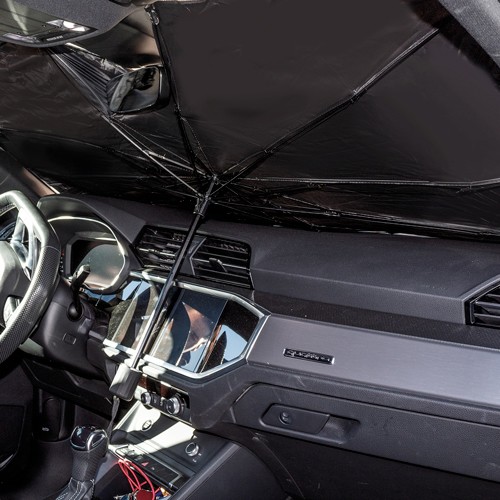 Windshield sunshade umbrella, foldable and compact design. It does not take up space in the car, it includes a protective bag in which it can be easily stored (bag size 11.5x32.5cm)
