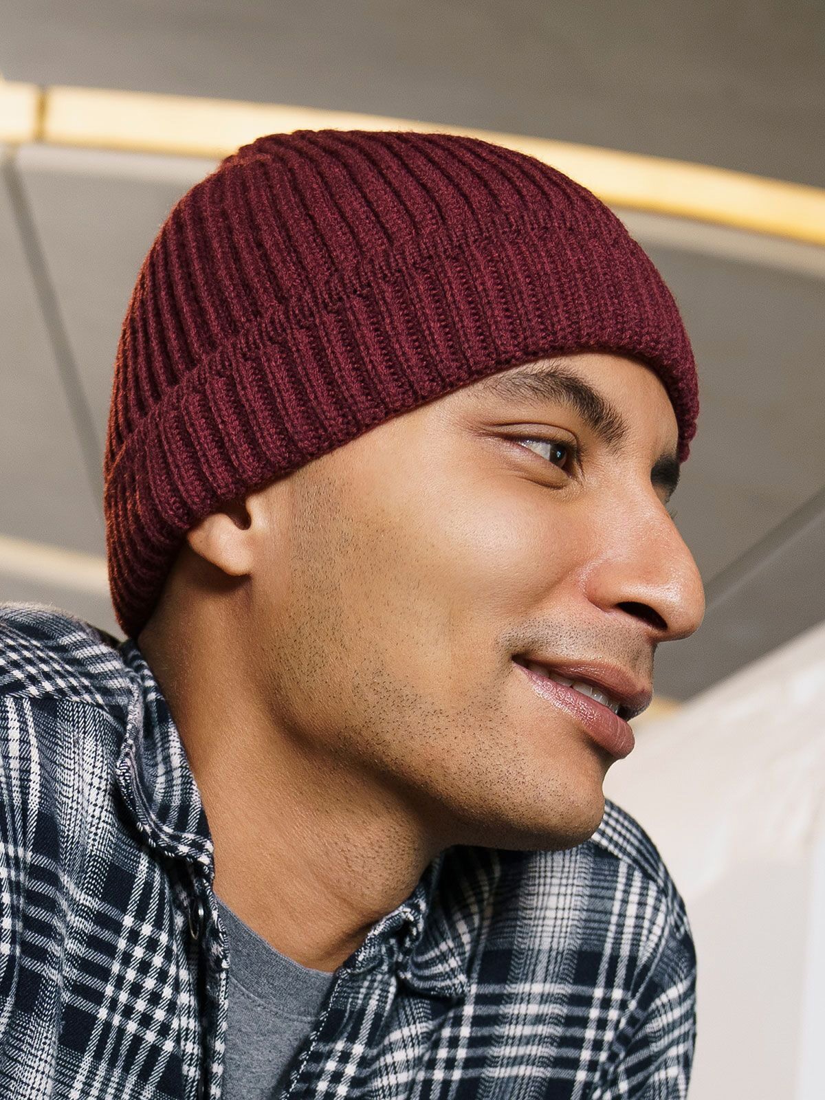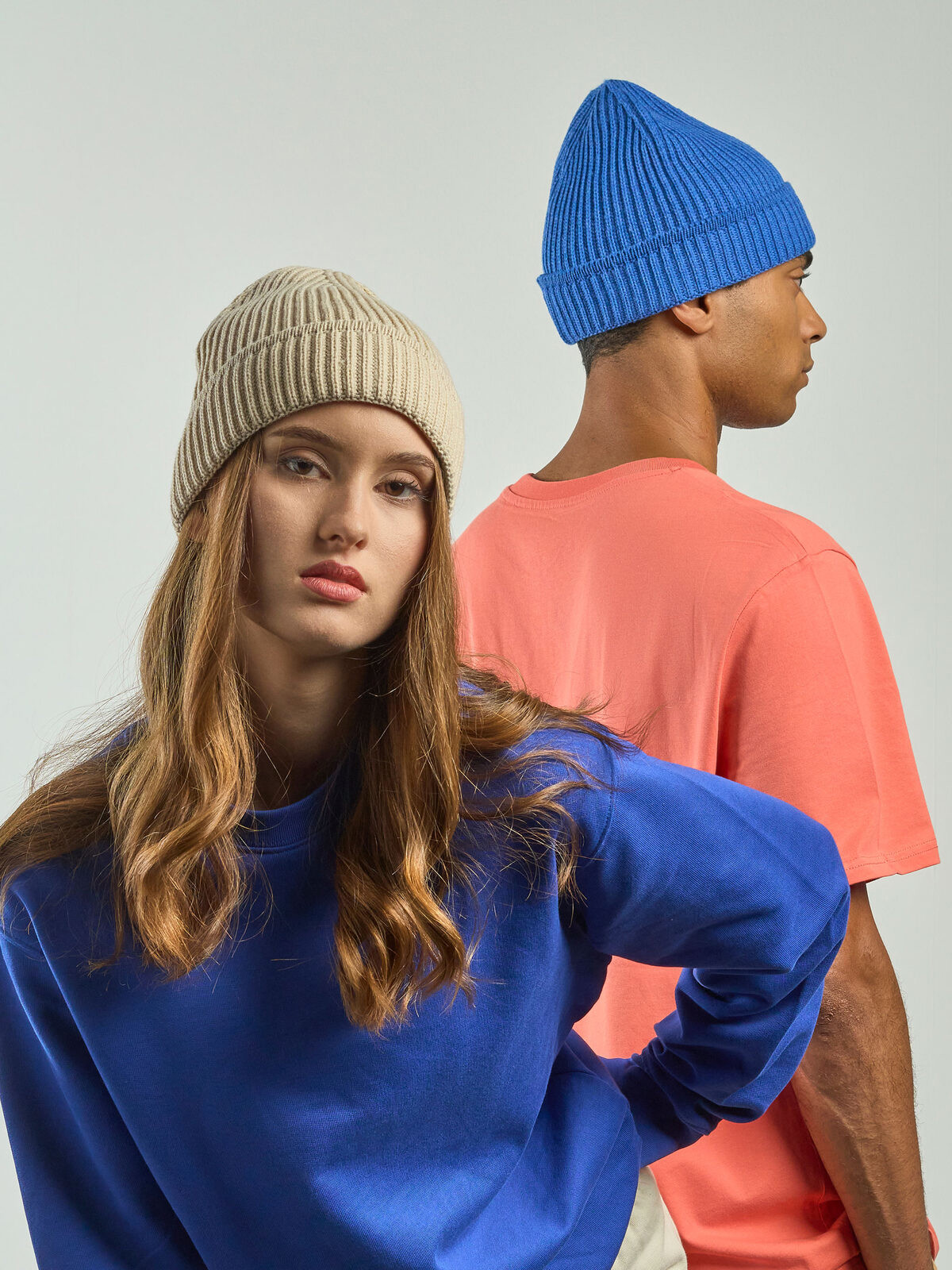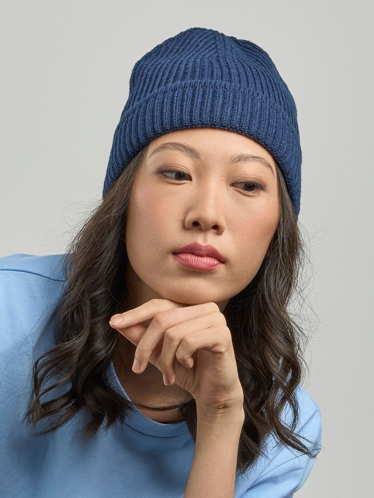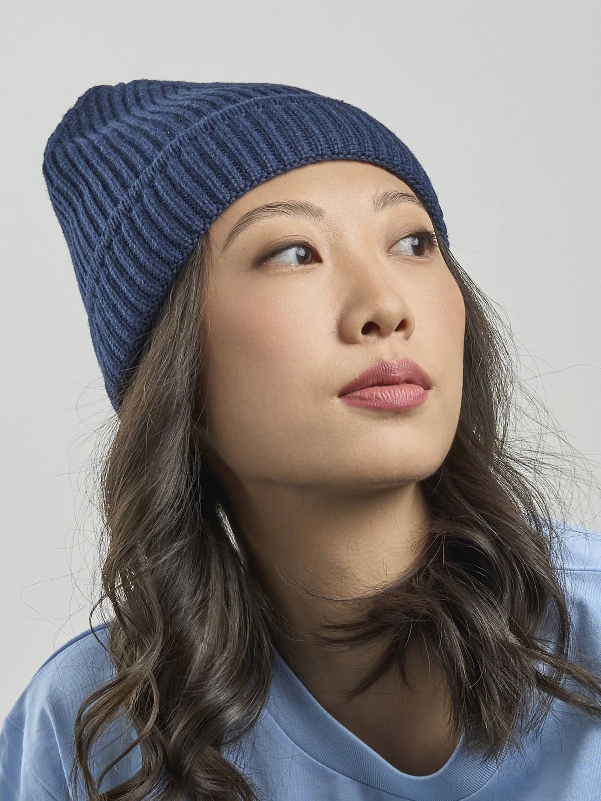 100% Polylana® . Knitted beanie with elegant rib-knitted cuff, easily fits in a pocket. Removable label.