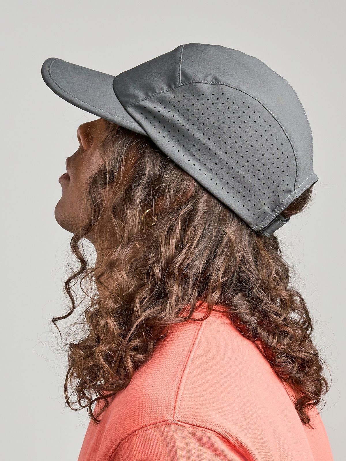 100% textile-to-textile recycled polyester . Lightweight, laser-perforated 5-panel hat for breathability, made of “moisture-wicking” fabric that can absorb moisture and diffuse it for very fast drying, recycled plastic visor interior.