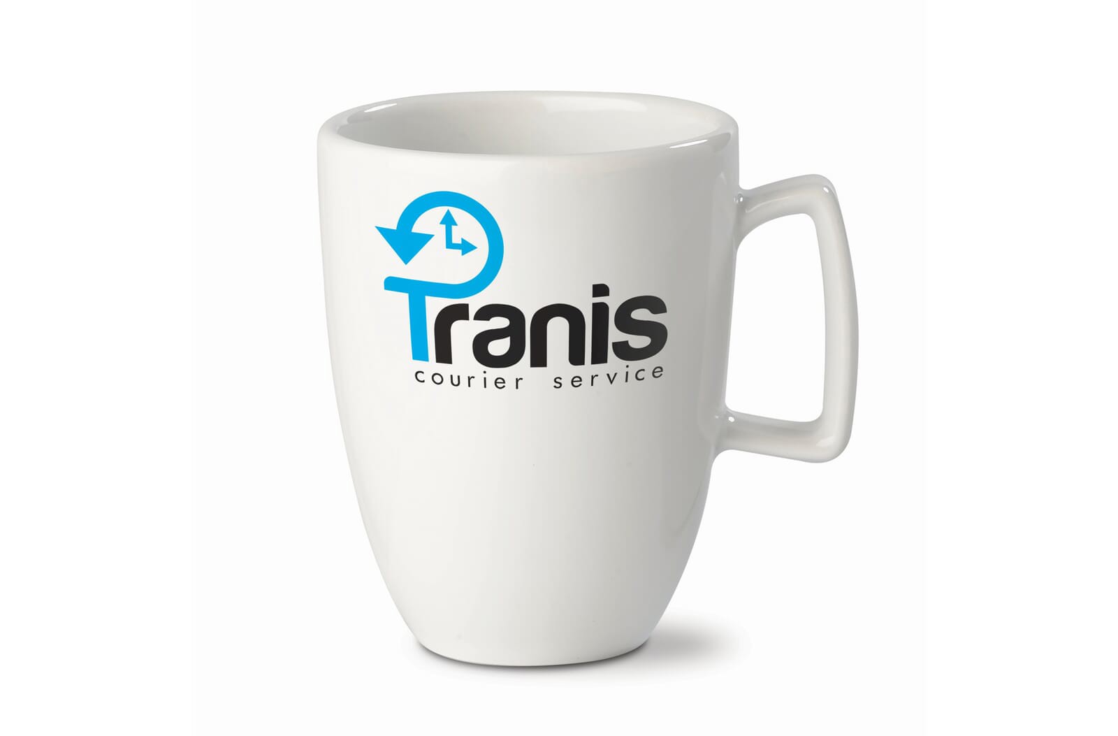 White mug made from porcelain. Conical and modern style. Made in Europe.