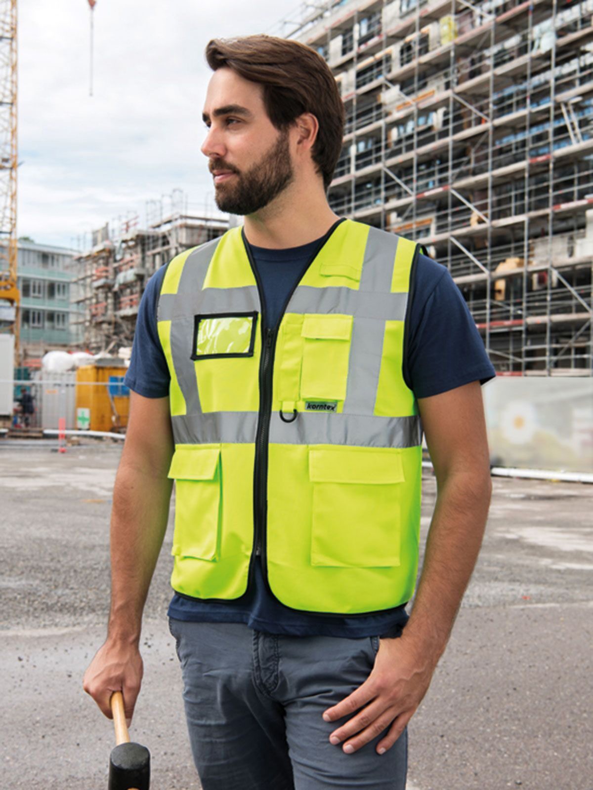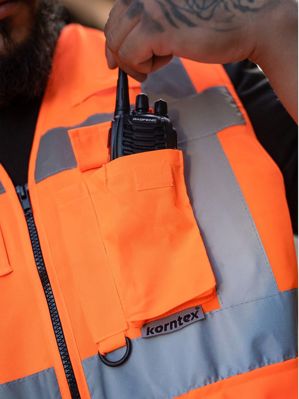 100% Polyester. Executive multifunction high-visibility safety vest with a practical and functional design. The colors yellow and orange comply with EN ISO 20471:2013 + A1:2016 and Oeko-Tex® Standard 100; orange also meets GO/RT 3279, neon colors comply with EN 17353:2020-AB3, and other colors follow EN 17353:2020-B3. Features a 5 cm wide reflective band around the body and two across the shoulders, front zipper closure, two pockets with Velcro, ID pocket, smartphone pocket, pen holder, and key holder. Reflective properties last up to 25 wash cycles at 40°C. Individually packed. Class 1: S–XXL, Class 2: 3XL–5XL.
