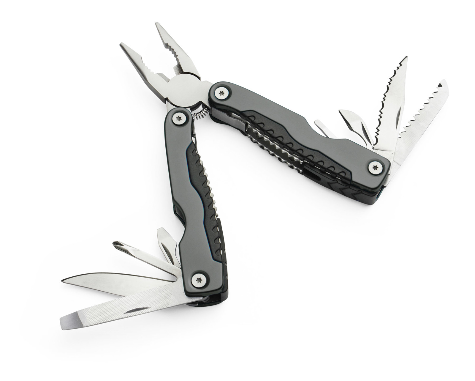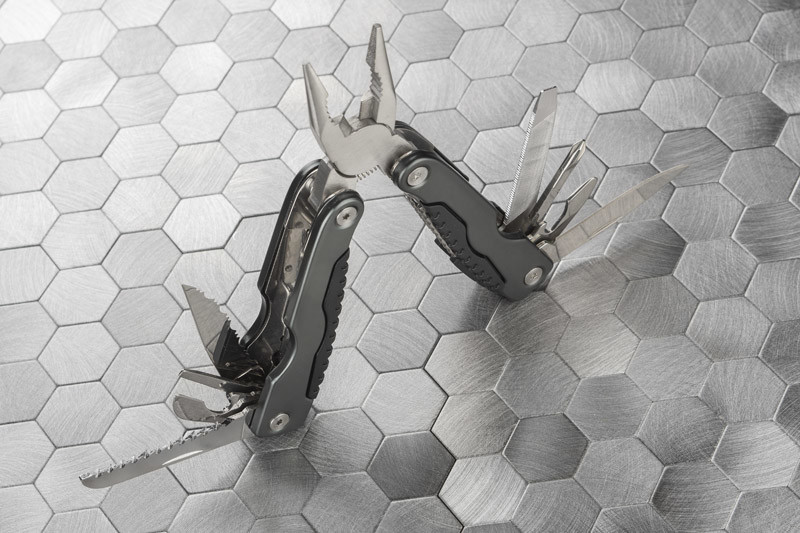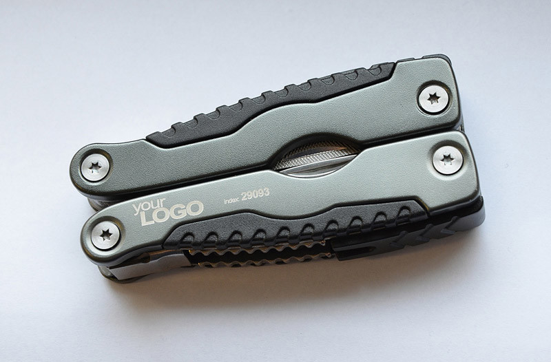 Multi function metal tool with metal handles. Packed into a sackcloth pouch that might be attached to belt. Tool consists of pliers, wood saw, can and bottle openers, wood and metal pile, Tool consists of pliers, wood saw, can and bottle opener, metal and wood file, flat and cross screwdrivers and two knifes (flat and serrated). Logo will be engraved on handles.