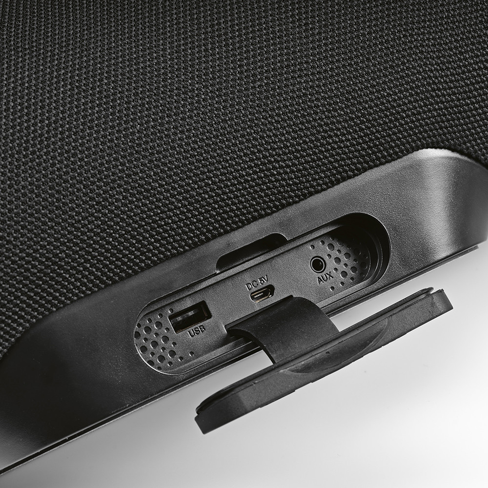 Opremljen z zmogljivim 6 W Bluetooth zvočnikom (BT 3.0) in brezžično polnilno ploščo, ta pripomoček zagotavlja bogat zvok in brezhibno polnjenje brez navlake kablov. Njegova litij-ionska baterija s 4000 mAh podpira do 10 ur predvajanja glasbe in lahko dvakrat brezžično napolni pametni telefon (odvisno od modela). Za dodatno prilagodljivost vključuje tudi vrata USB za uporabo s tradicionalnim polnilnim kablom.