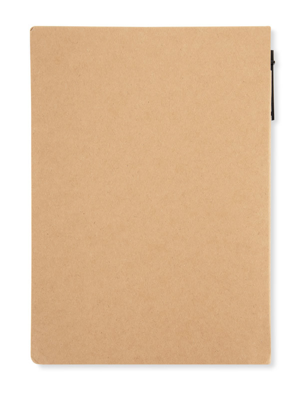The DELA notebook in A5 format is a practical promotional gadget made of kraft paper. It features 40 smooth sheets, a pen included in the set, and a pocket for loose papers, ensuring convenient use. Its simple and functional design makes it perfect for everyday use. With our branding service, the notebook can be fully customized to fit your brand's needs. It is an ideal choice for business meetings, events, or as part of advertising campaigns.