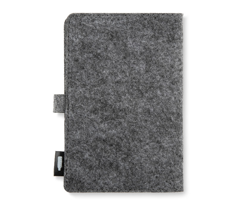 Handy A6 EVERO notebook made of felted rPET material. With its button closure and checkered pages, it is ideal for travel or meetings. Thanks to its handy format, it fits easily into your bag without taking up much space. It is lightweight and practical, so it is perfect as a corporate gadget or as part of a welcome pack.