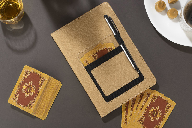 Zvezek A5 s 160 stranicami, obloženimi s smetano, z 80 g / m2 papirja. Sprednji pokrov ima prilagodljiv žep za telefon, žep za pisalo in večji žep za rokave za dokumente. Telefonski žep je širok 8 cm, kar ustreza iPhone 7 plus.