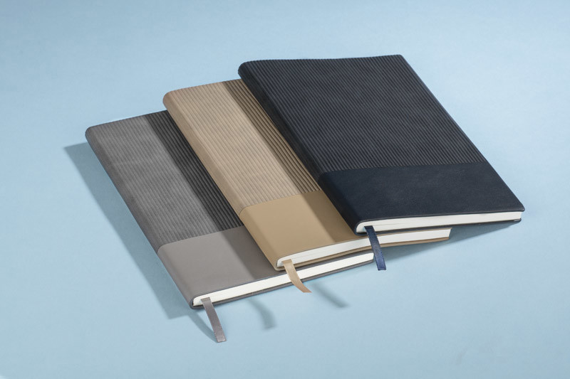 The FLAF notebook in A5 format features a soft cover combining leather-like (PU) material with a corduroy-style fabric, giving it a pleasant, textile texture. Inside, it includes 80 dotted pages and a practical ribbon bookmark.