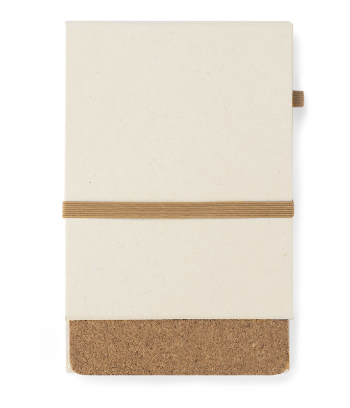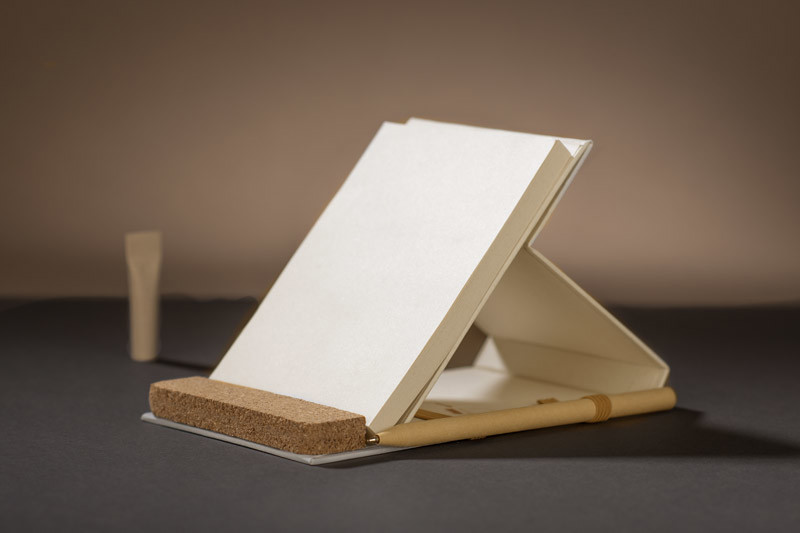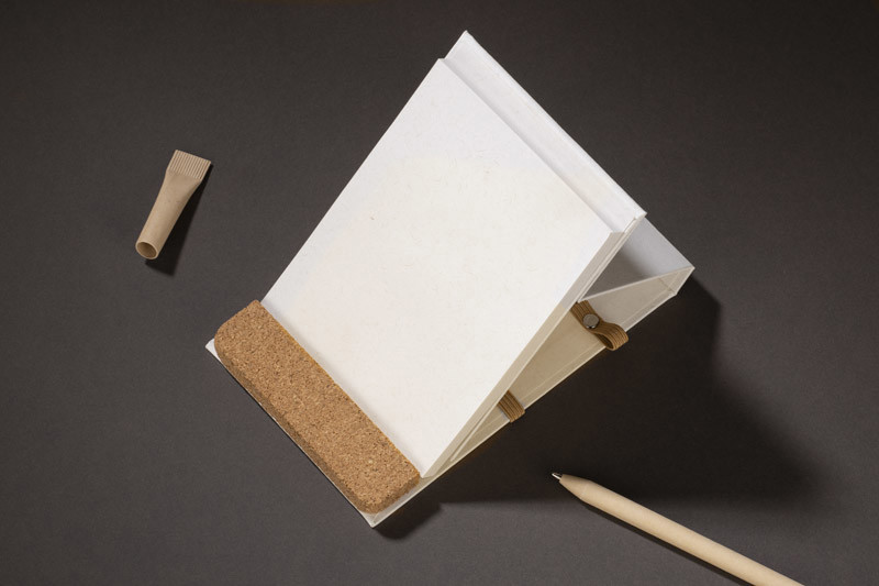 The cover and pages in the notebook were made of milk cartons. The cover is closed with an elastic band. The cork element completes this product visually, and also allows you to create a phone stand from the notebook. The notebook has 80 plain sheets.