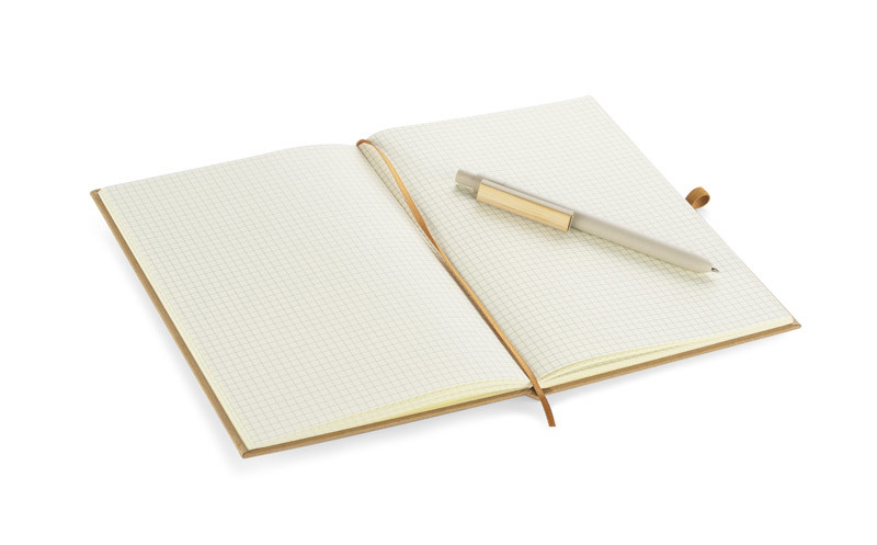 RITTO notebook in a hard cover made of kraft paper in a classic brown color. It has a tab in the form of a ribbon. Notebook in the set with a pen made of a mixture of plastic and bamboo, in the proportion of 50% plastic 50% bamboo. Pen clip decorated with a bamboo element. This set will surely appeal to enthusasts of minimalism in design. Contains 80 squared sheets, A5 format.