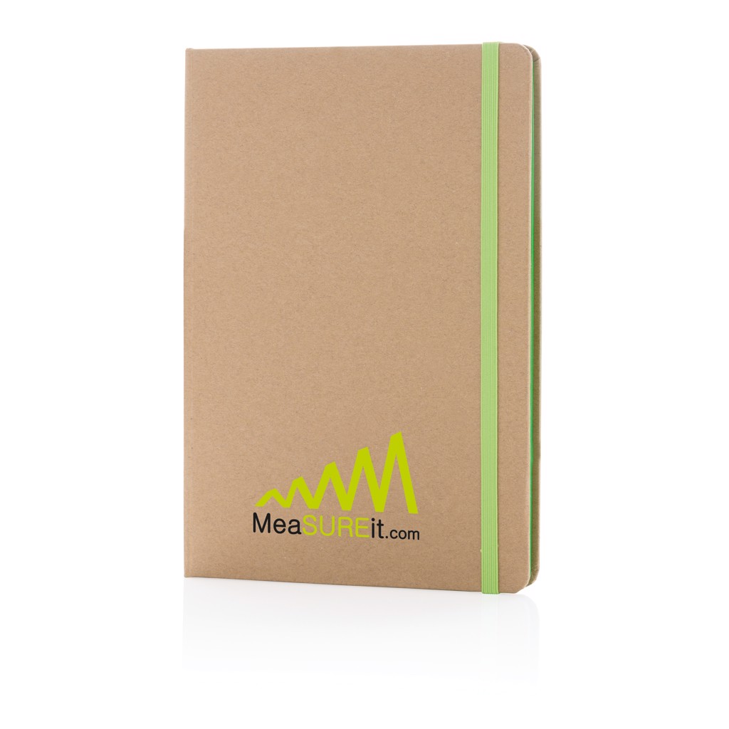 Reciklirani obrtni zvezek pokriva z recikliranim papirjem. 72 listov / 144 strani papirja 70 g / m2. Krem obarvan papir. Elastični trak in trak z zaznamki.