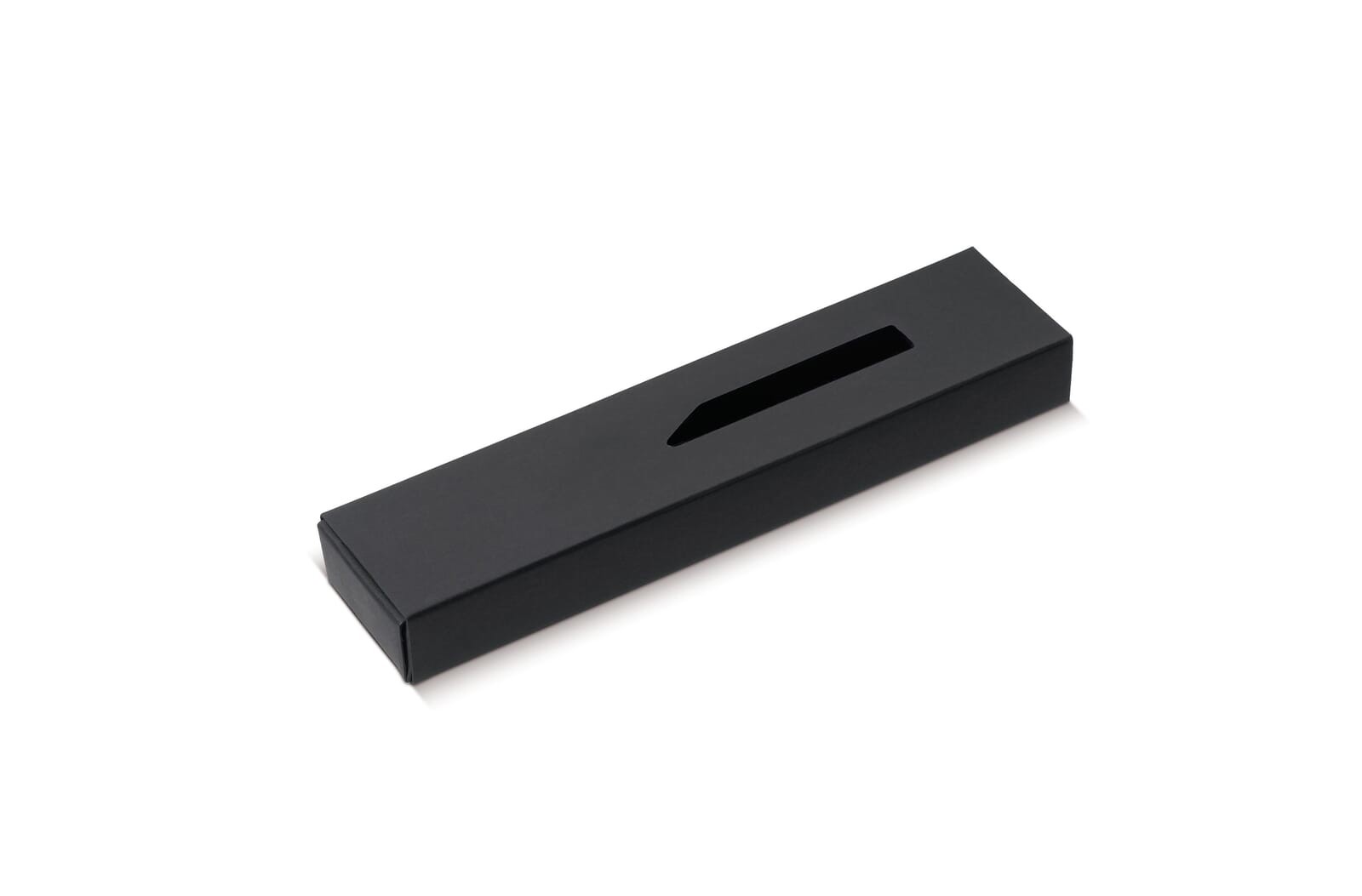 Rectangle black carton gift box for one ball pen, has a window and sliding lid. Printing on the box is possible.