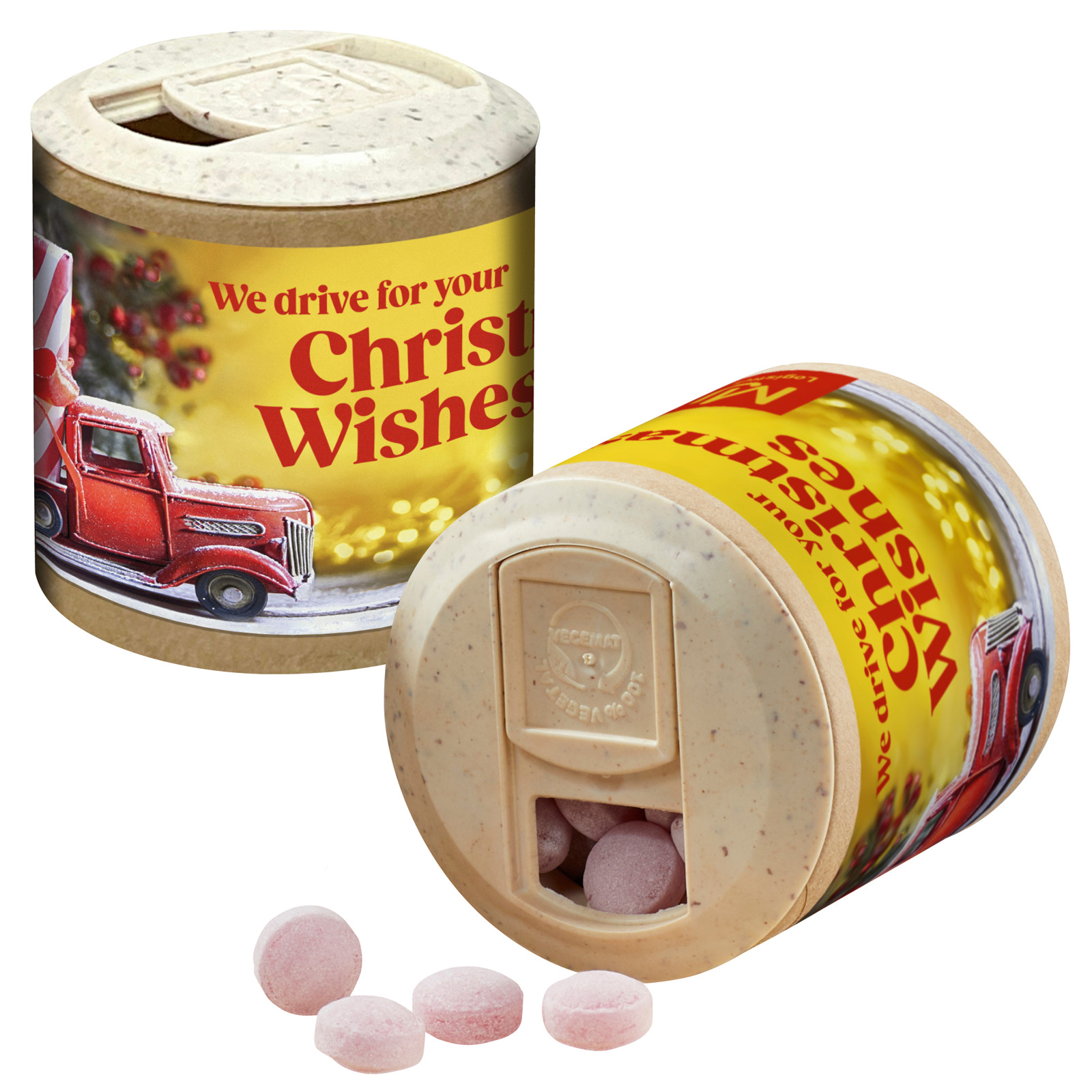 Kraft paper tin with compostable lid, without sleeve, with all-around promotional label. Just push in tamper-evident closure under the slidable refastenable lid – and enjoy the tasty content.