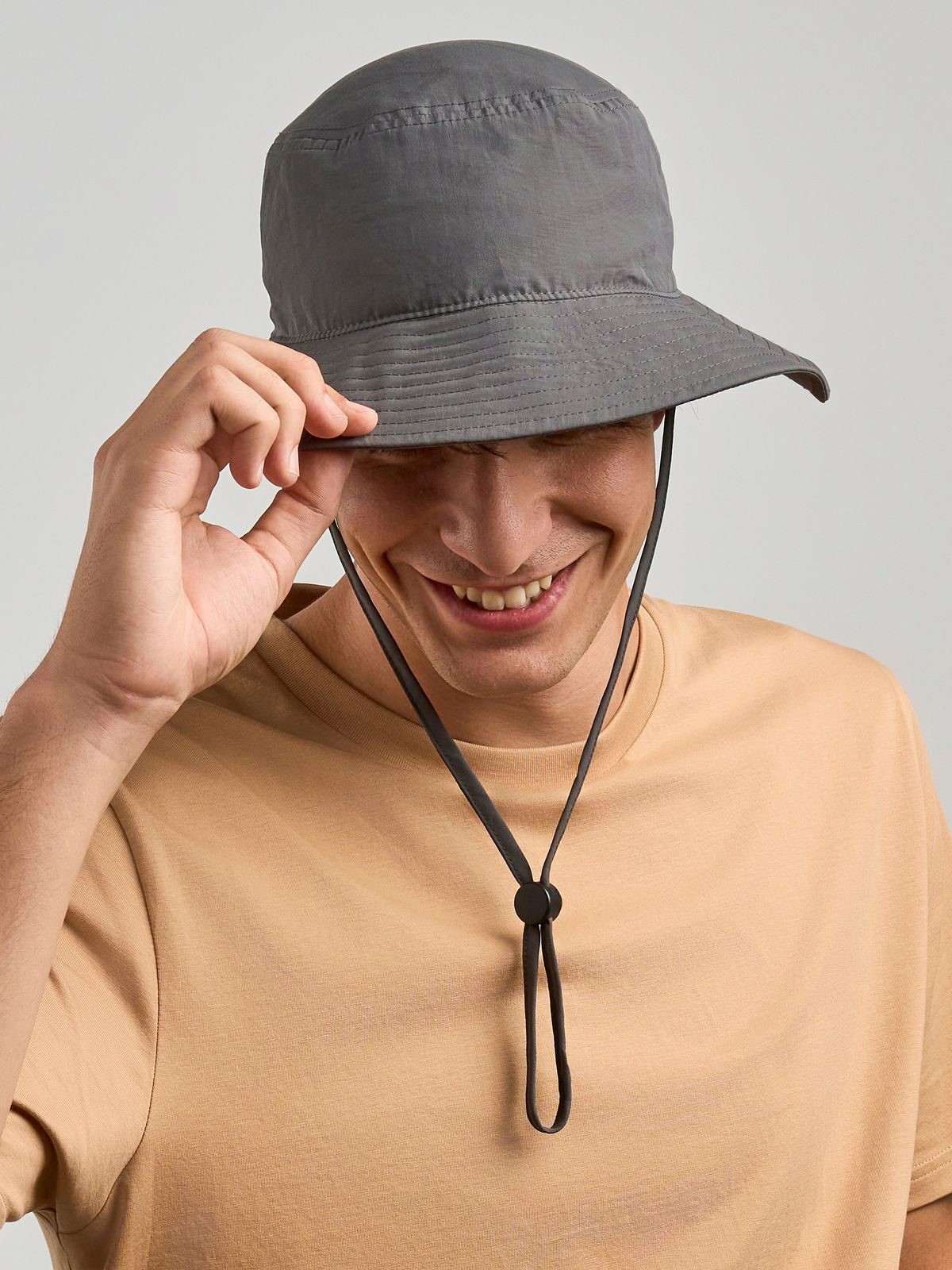 100% recycled nylon. Fisherman's hat with adjustable drawstring, waterproof.