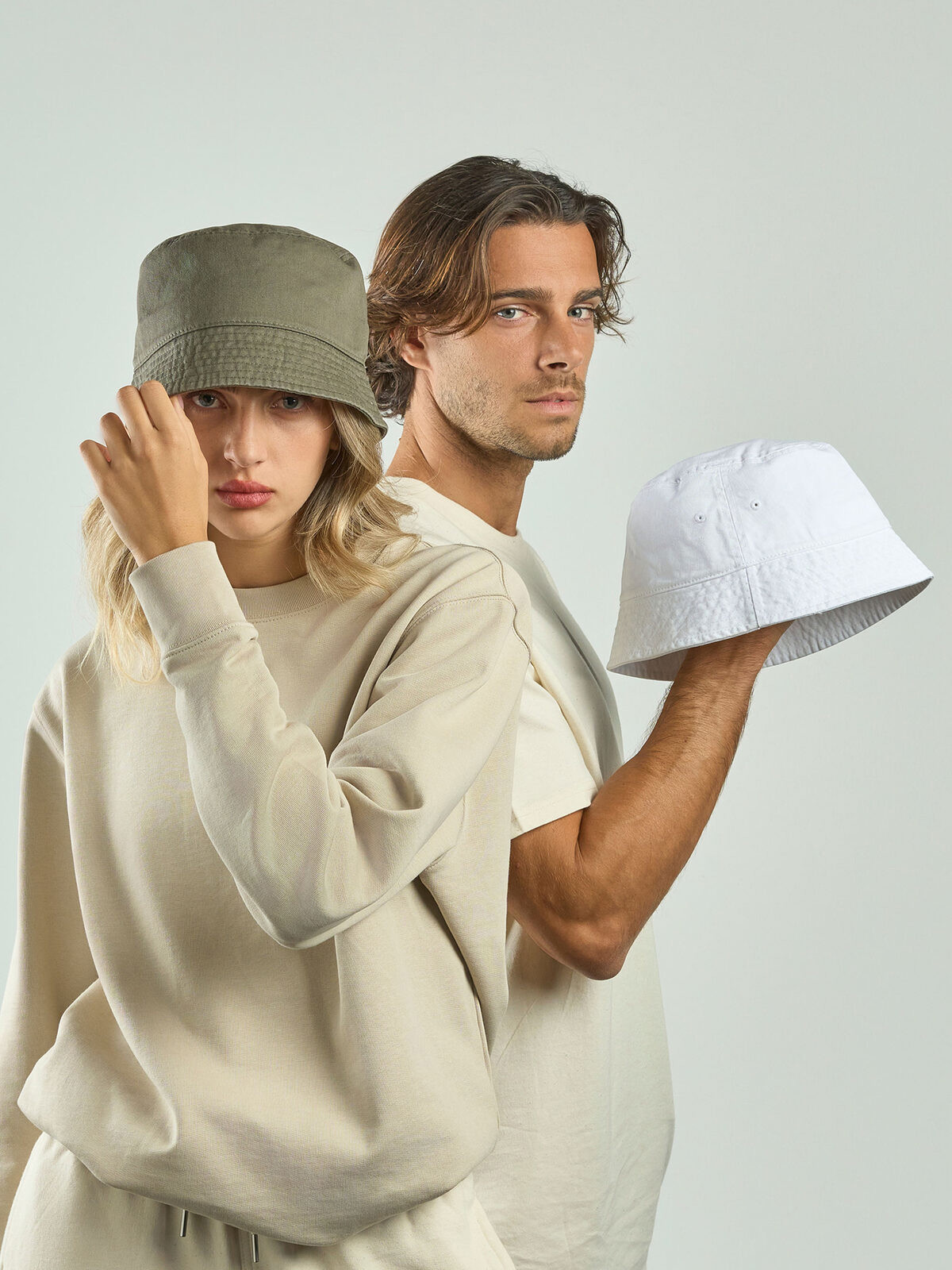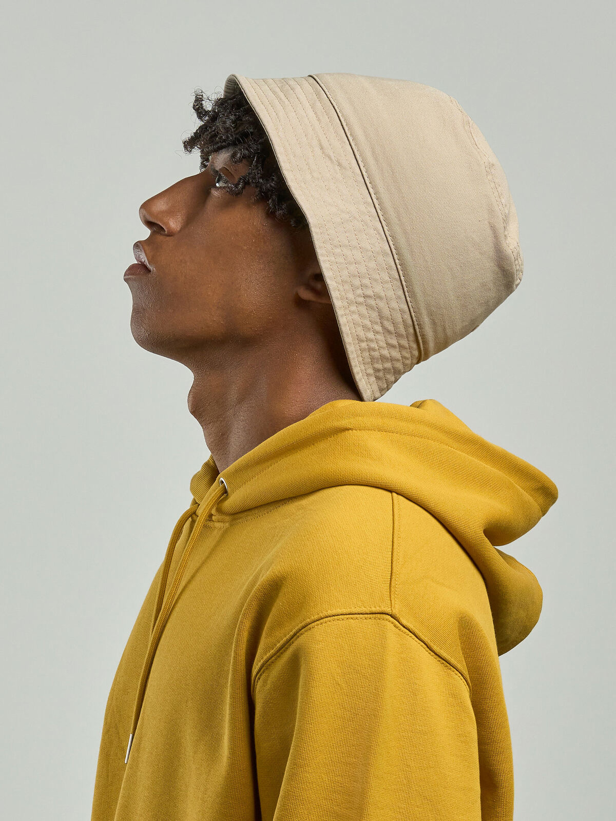 60% certified recycled cotton 40% cotton twill. Stylish and young bucket, short and steep brim. It can be folded to fit in a pocket. Two eyelets on the back for more ventilation. Removable label.