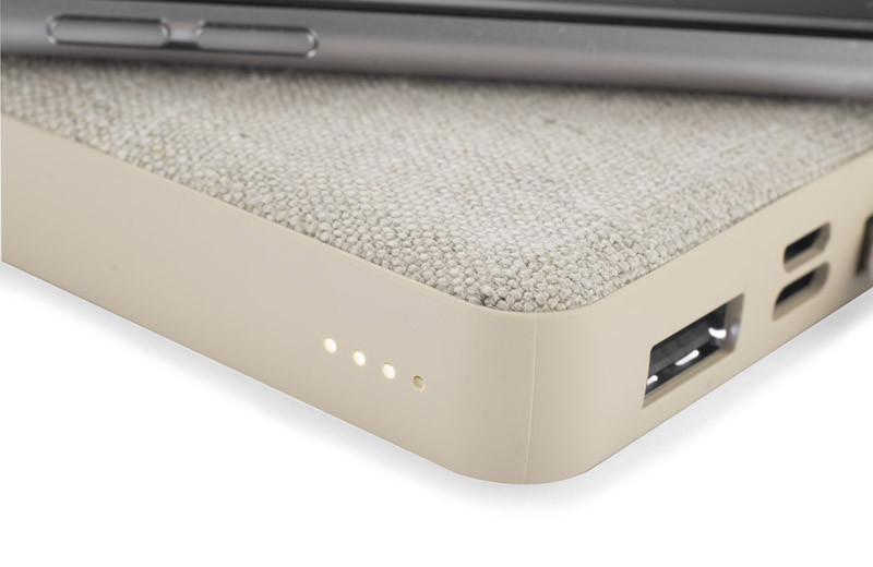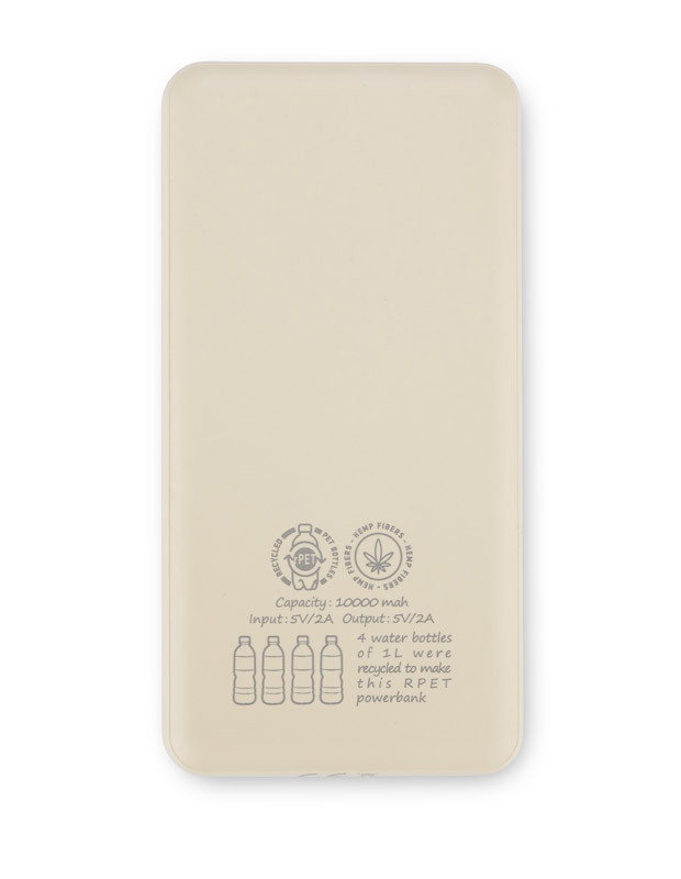 The rPET REPPO power bank with a capacity of 10000 mAh is made of material recycled from four 1-litre bottles and hemp fibres. The product has the ability to charge via 4 ports: 2 x USB-A, 1 x USB-C, 1 x microUSB. Specifications: - input: 5V/2A, - output: 5V/2A. Four-stage charge indicator. Product complies with the relevant European Union directives, CE mark and 1 year warranty. MicroUSB charging cable included. Packaged in a recycled cardboard box with printing using soya-based ink.
