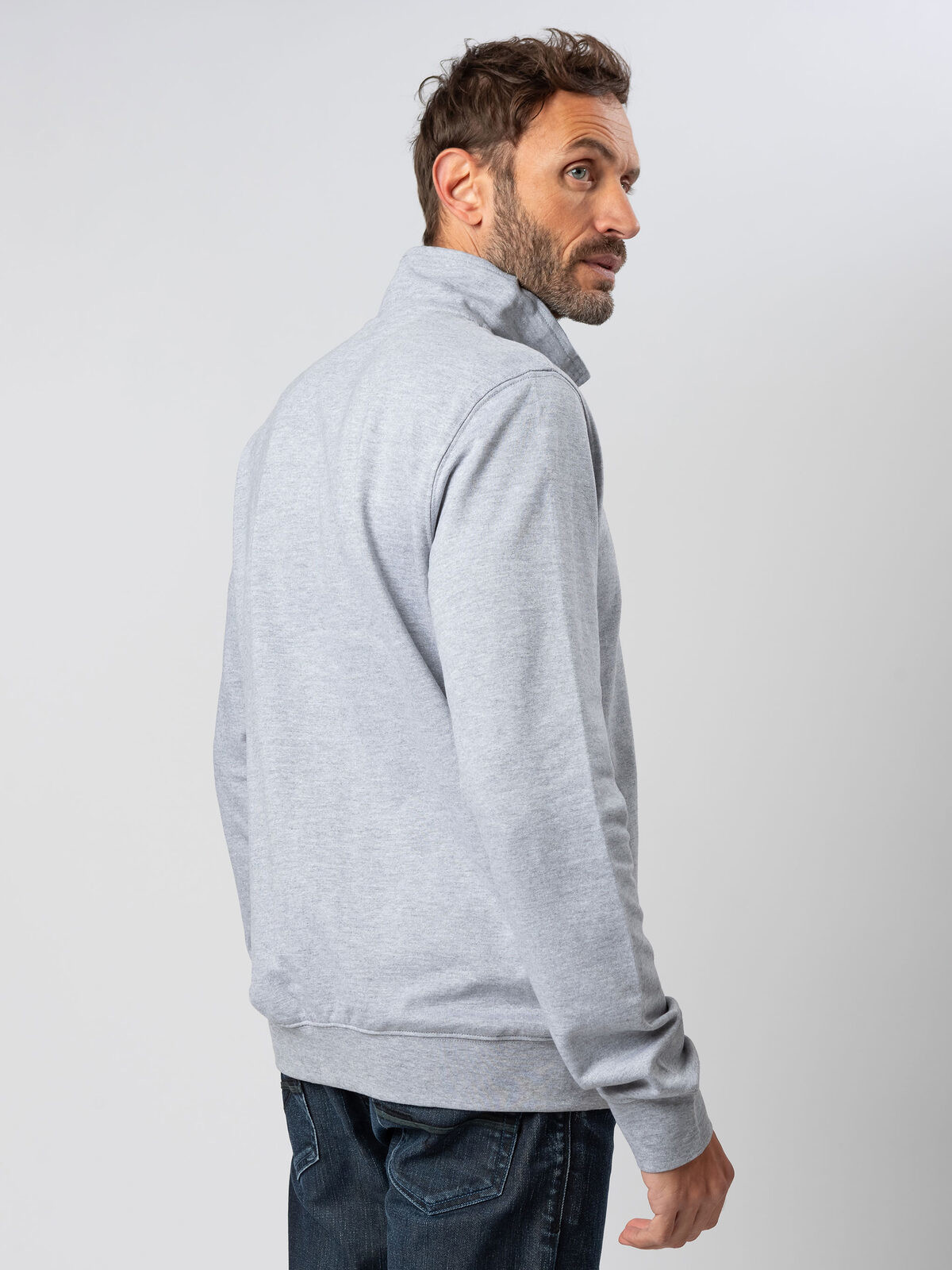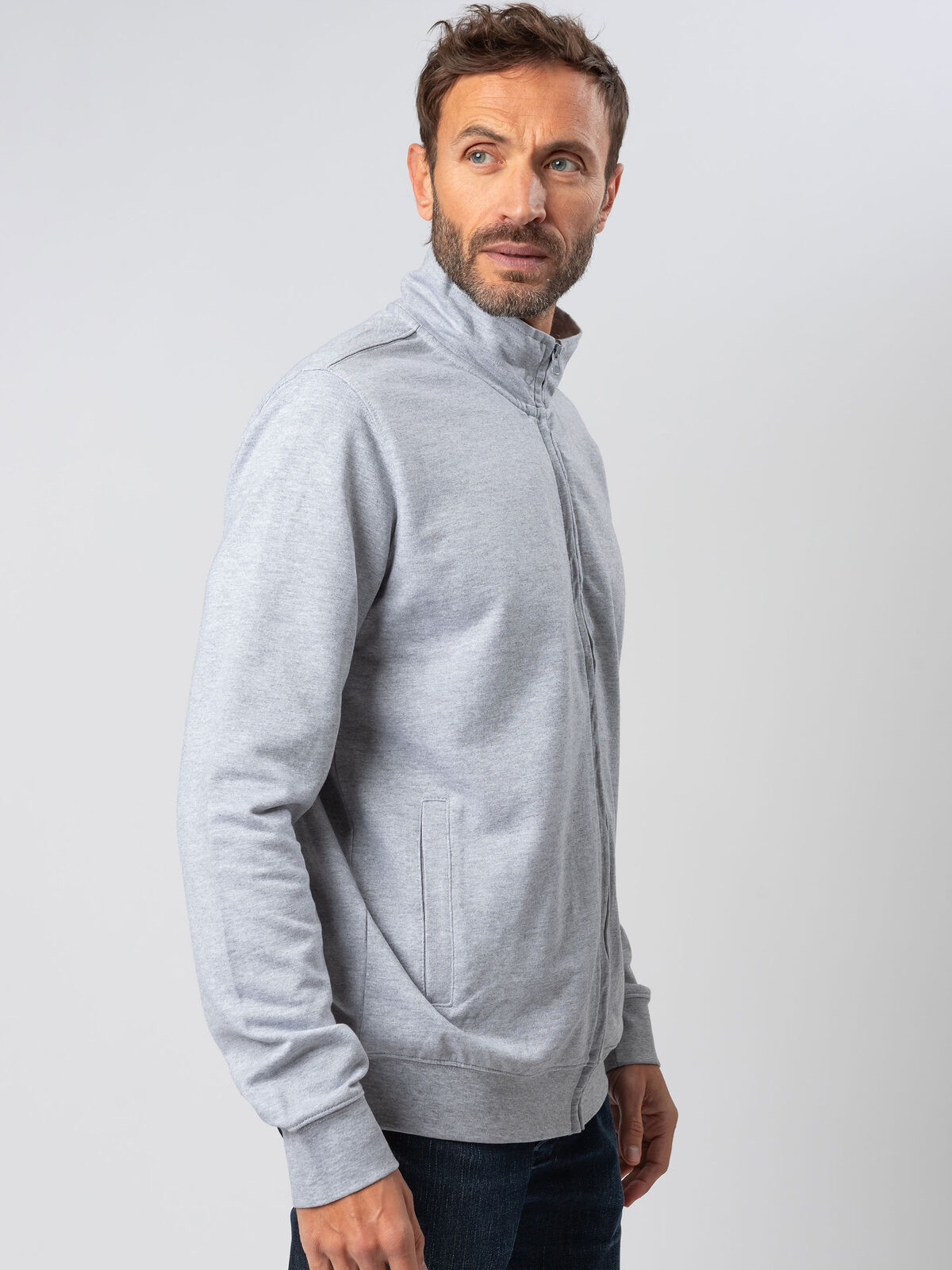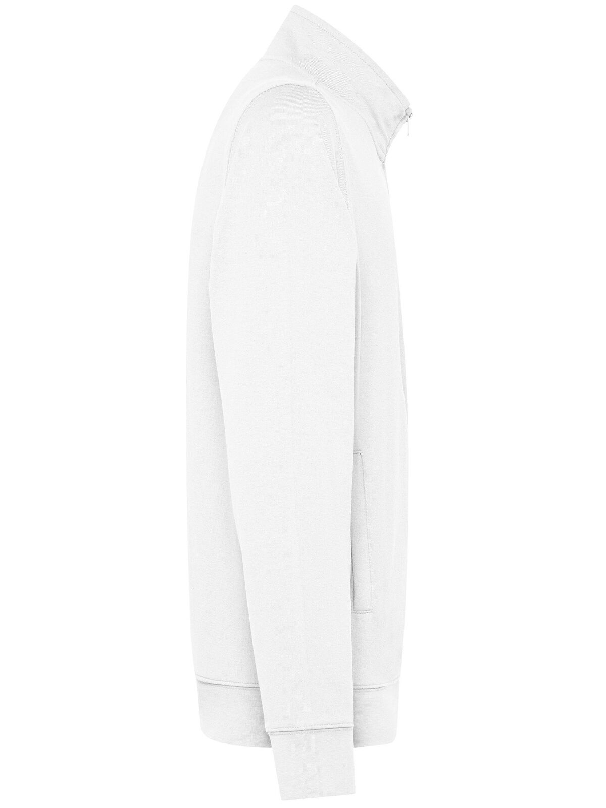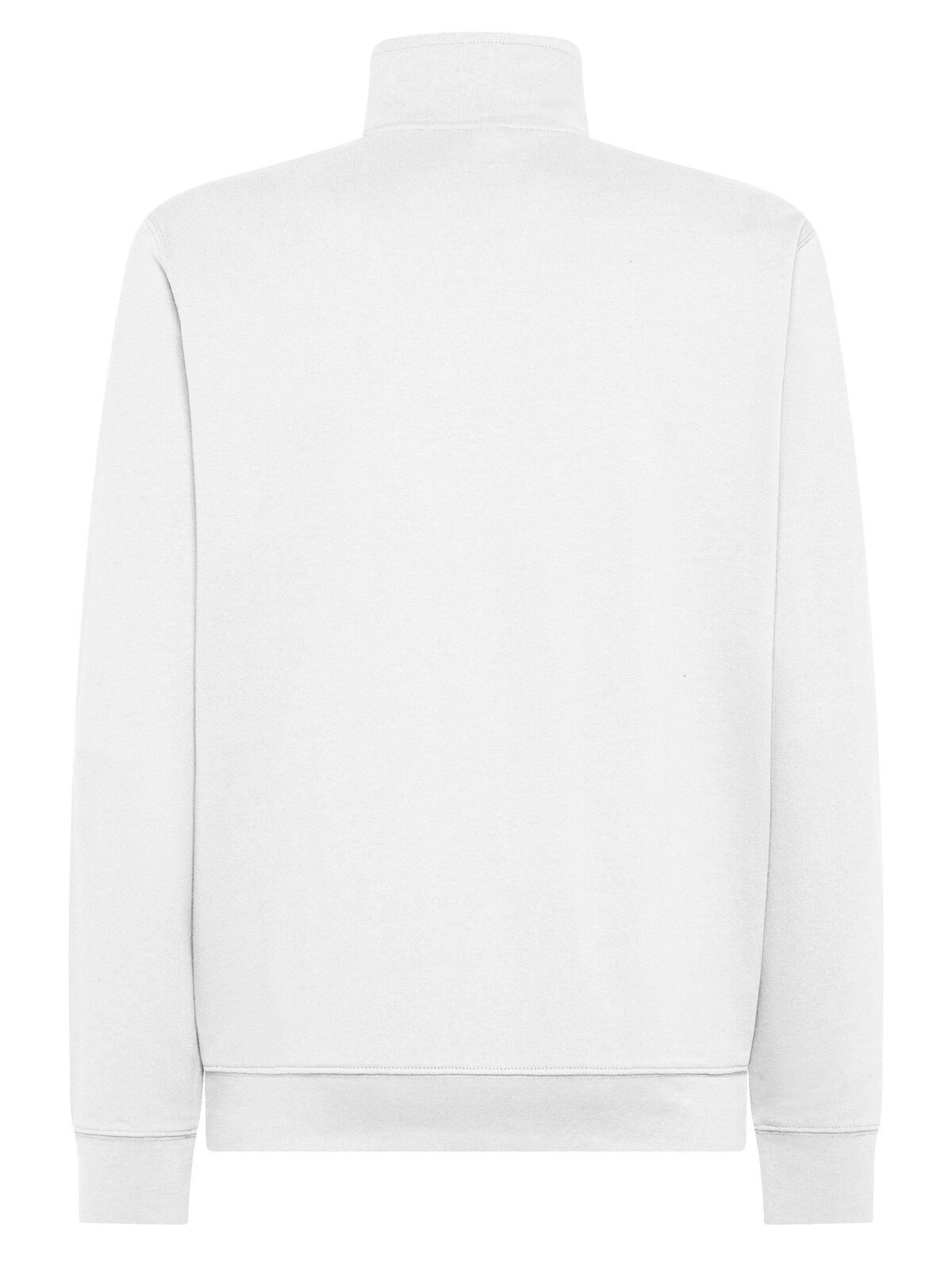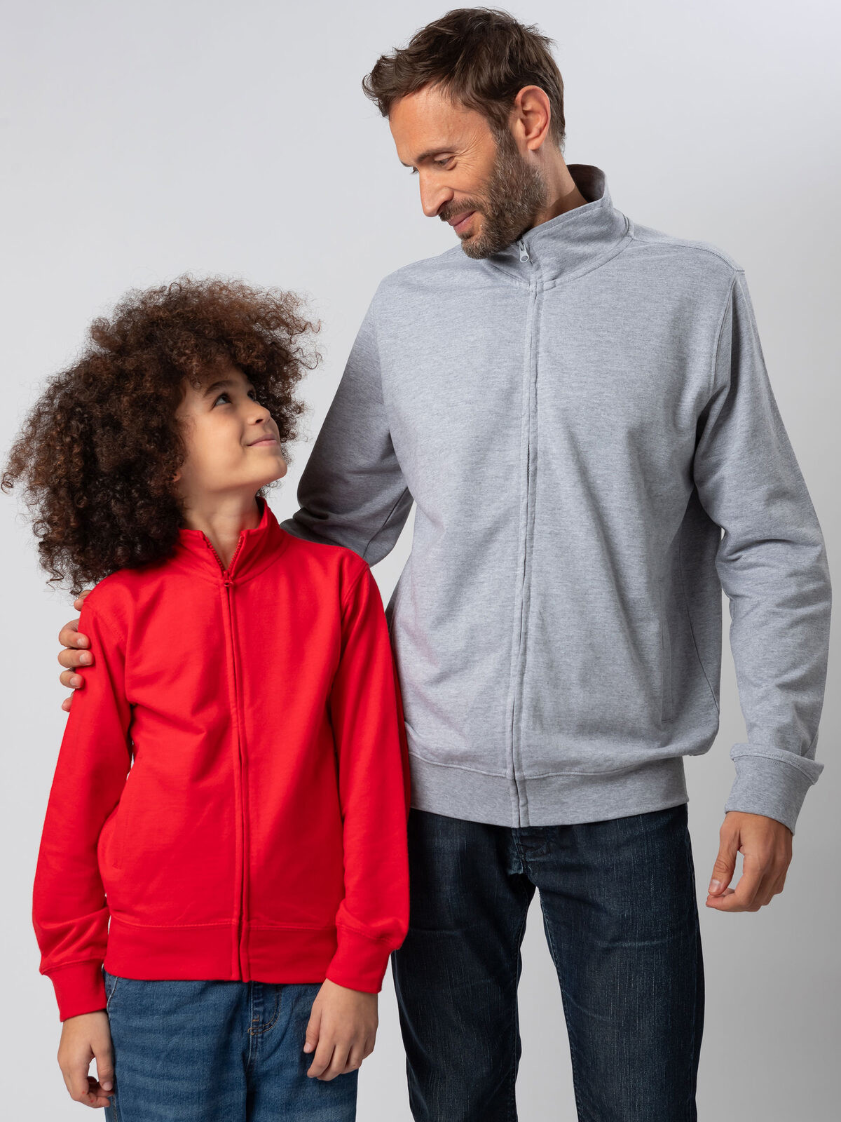 80% cotton, 20% polyester. French Terry sweatshirt with full zip, set-in sleeves, high collar, welt pockets. Lower hem and ribbed cuffs, structure with side seams. 100% cotton exterior for excellent print quality, dimensional stability, and wash resistance. Tear-off label.