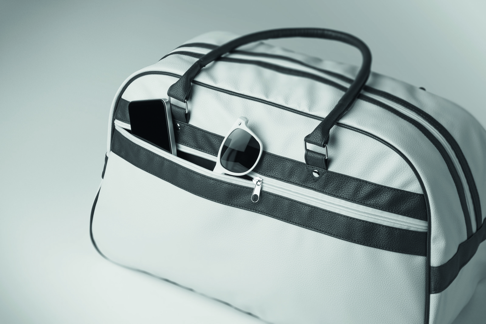 PU sports bag, inner lined, main compartment and zipped pocket, sturdy handles, base inlay and studs. Capacity approx. 21.5 litres.