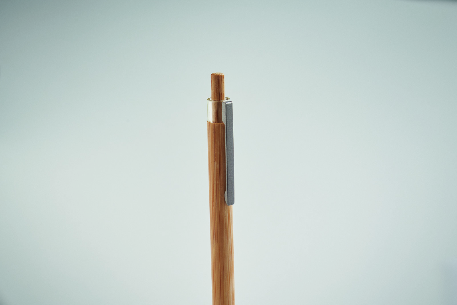 Push button pen with bamboo barrel and metal clip. Blue ink.