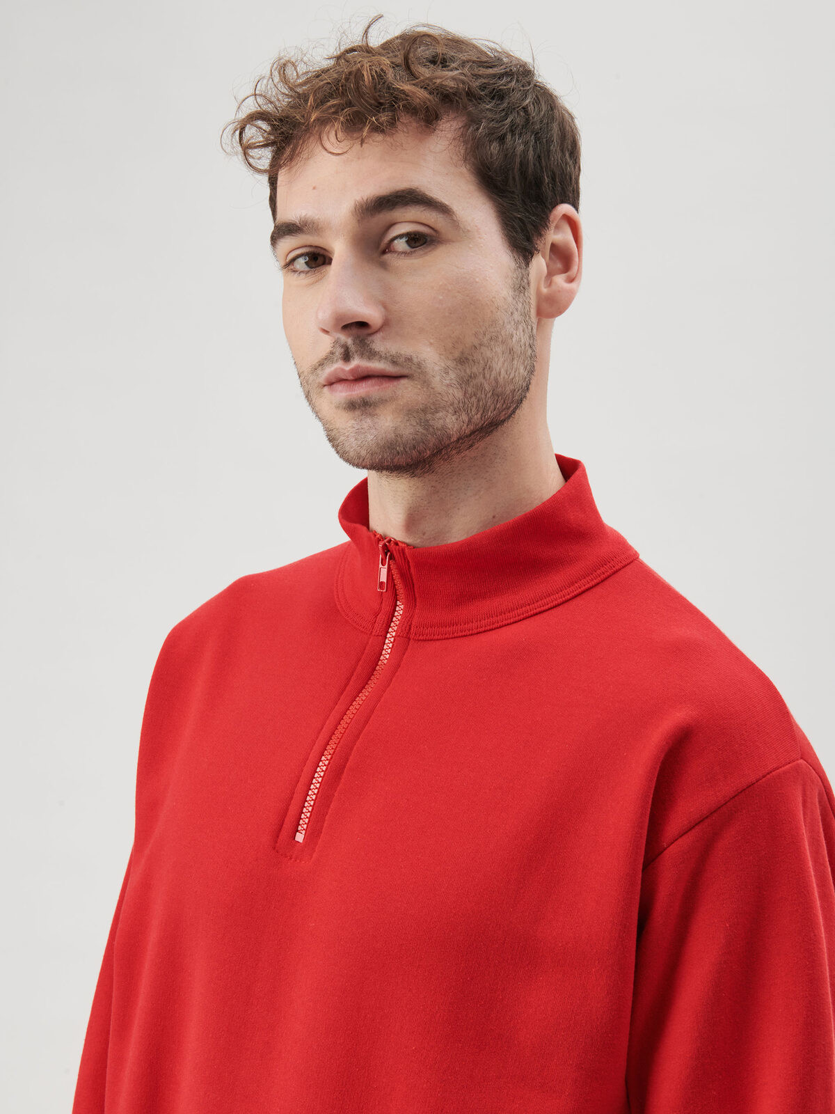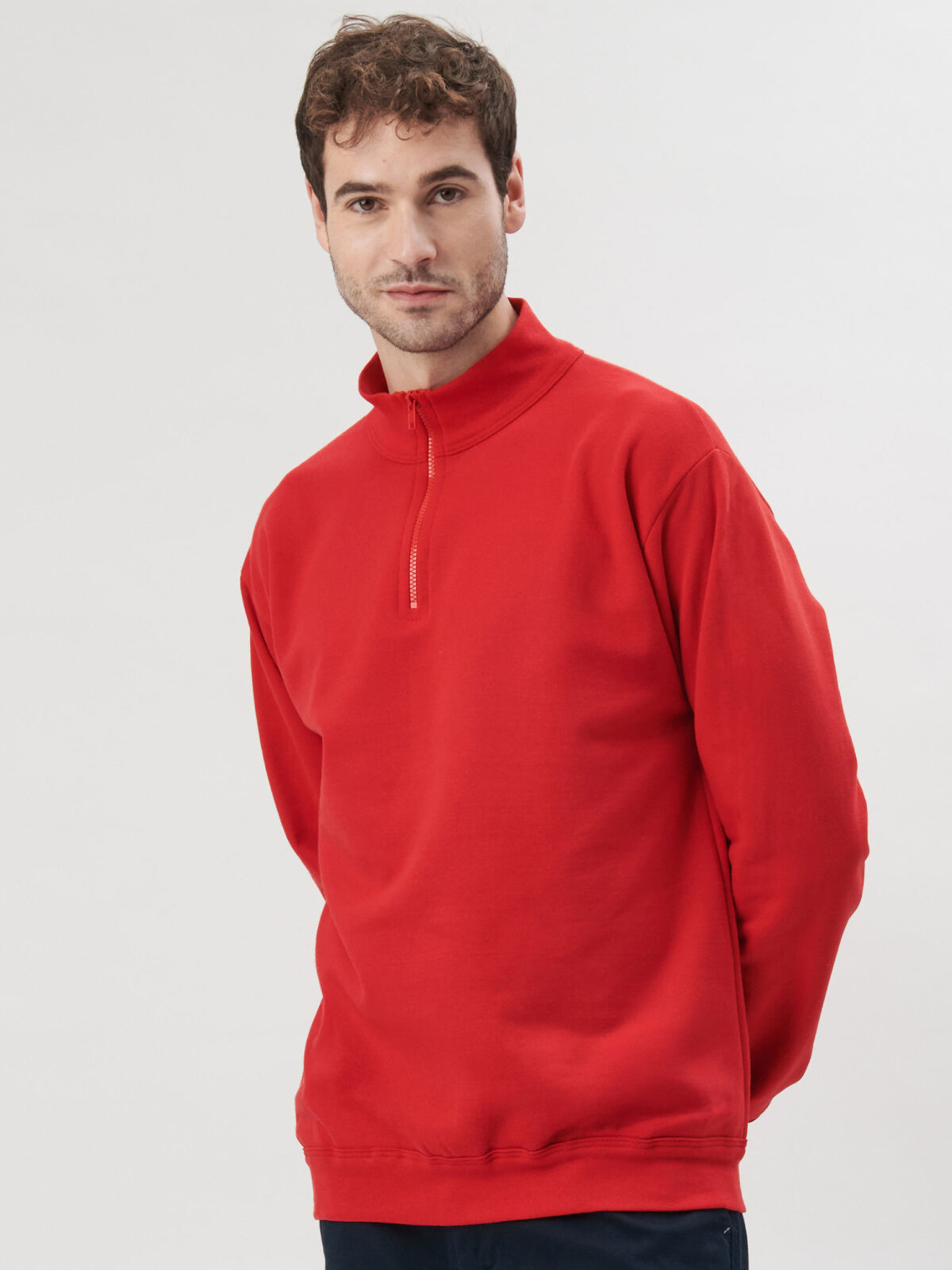65% recycled cotton, 35% recycled polyester. Half-zip sweatshirt in recycled cotton and polyester fabric, straight sleeve, fleece inside. 3-thread construction: 100% cotton exterior for excellent print quality, dimensional stability, and wash resistance. Entirely Italian production. Plastic zip, metal zip puller. Side seams. Tear-Away label.