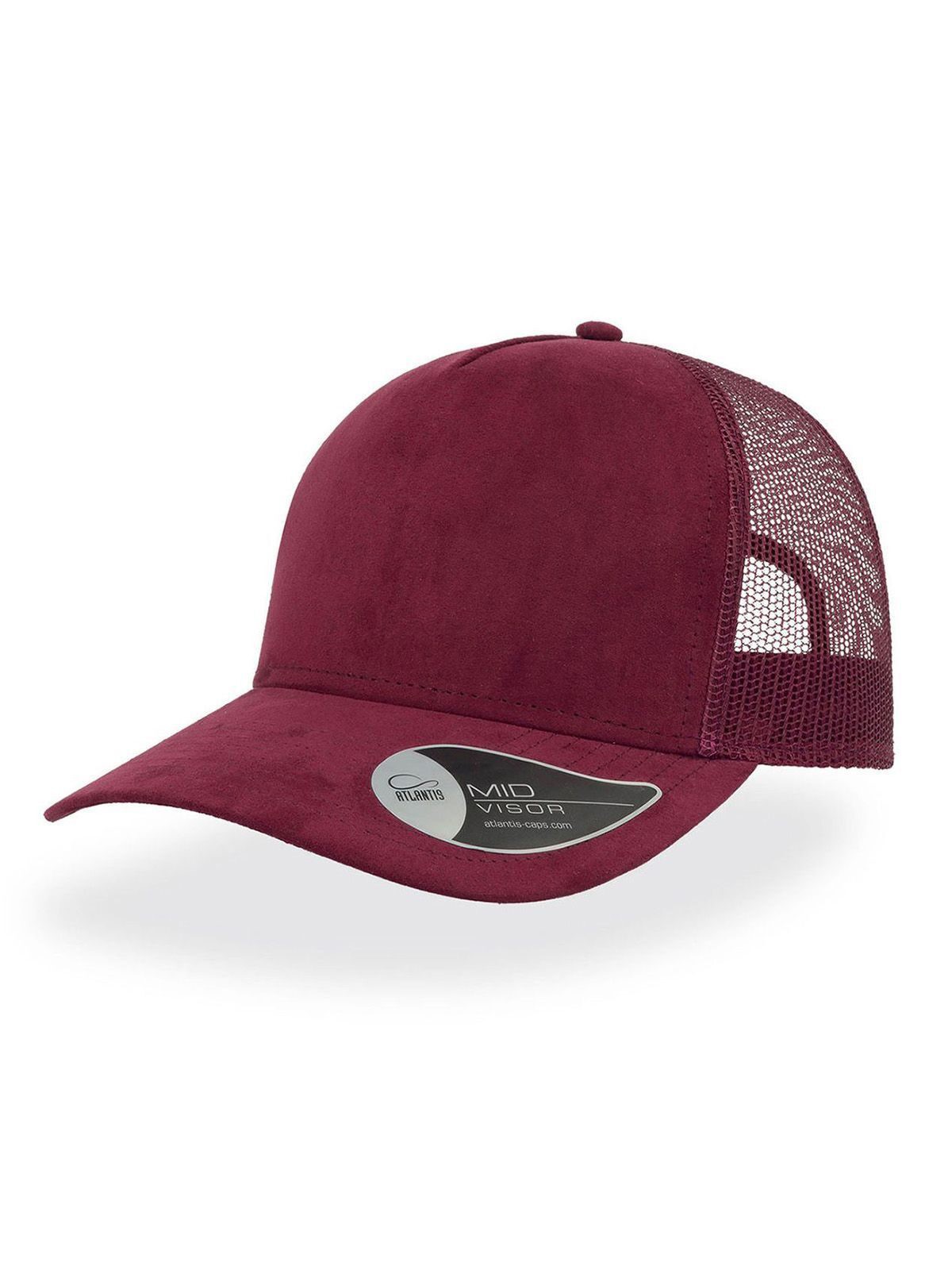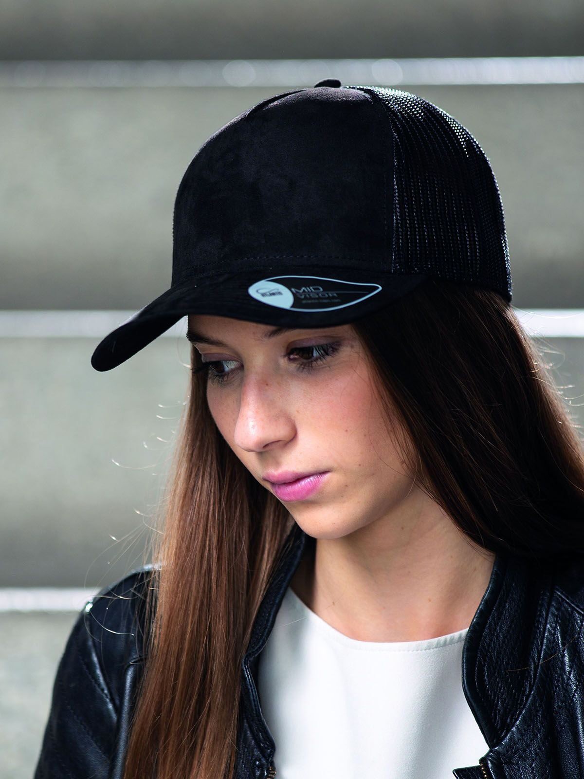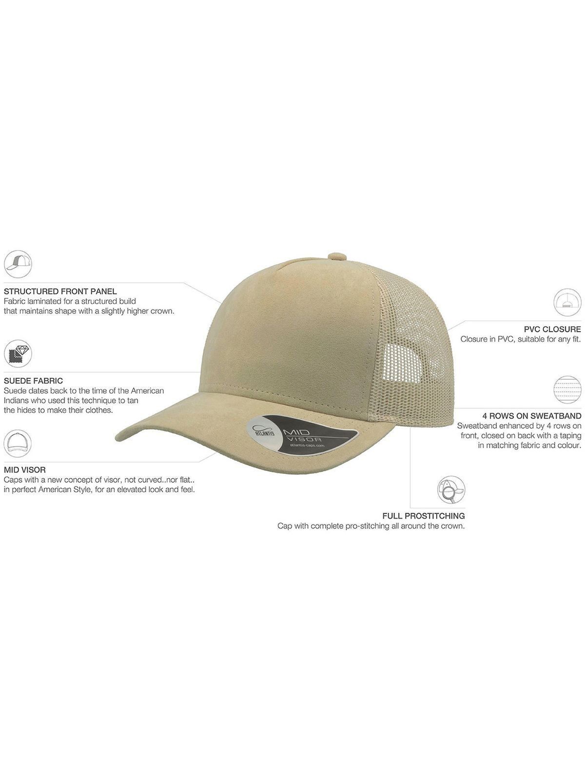 100% polyester. 5 panels cap, mid visor, back mesh, one size fits all. Removable label.
