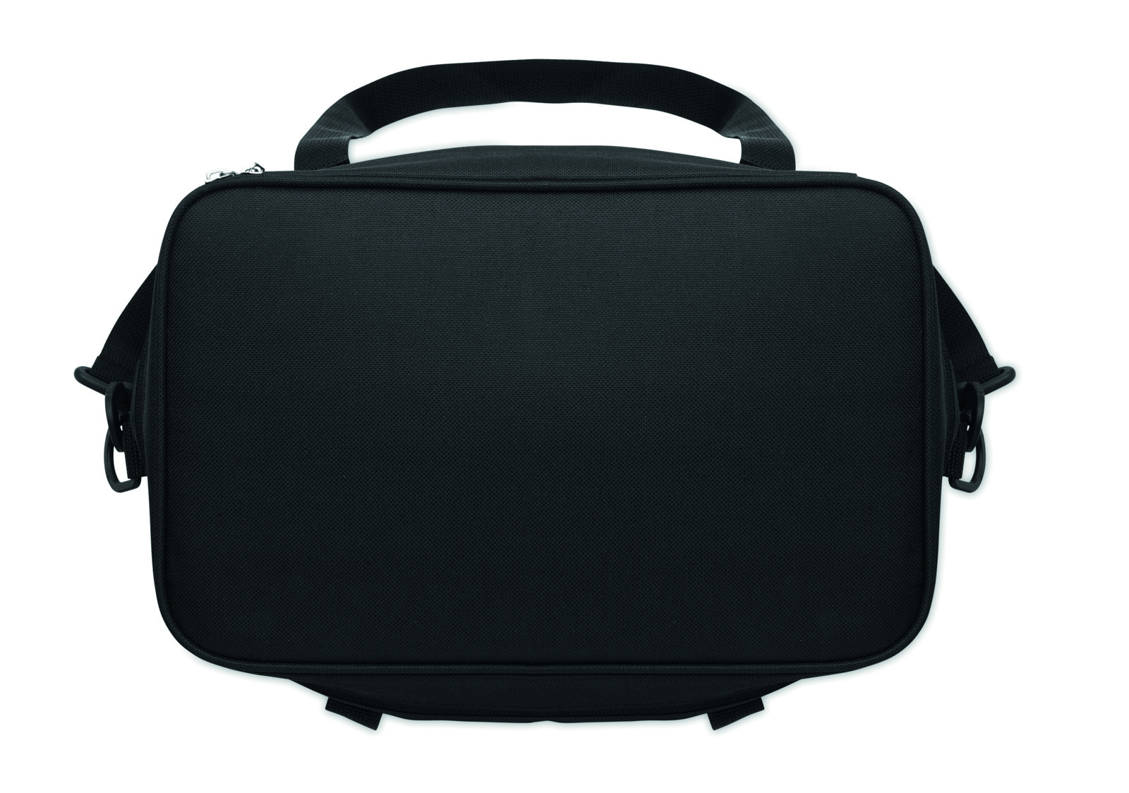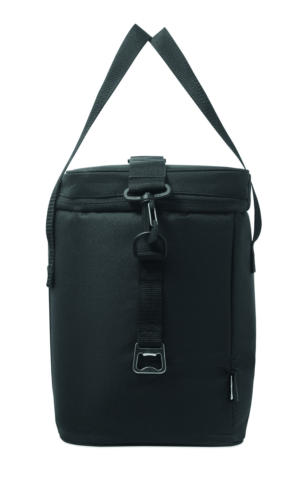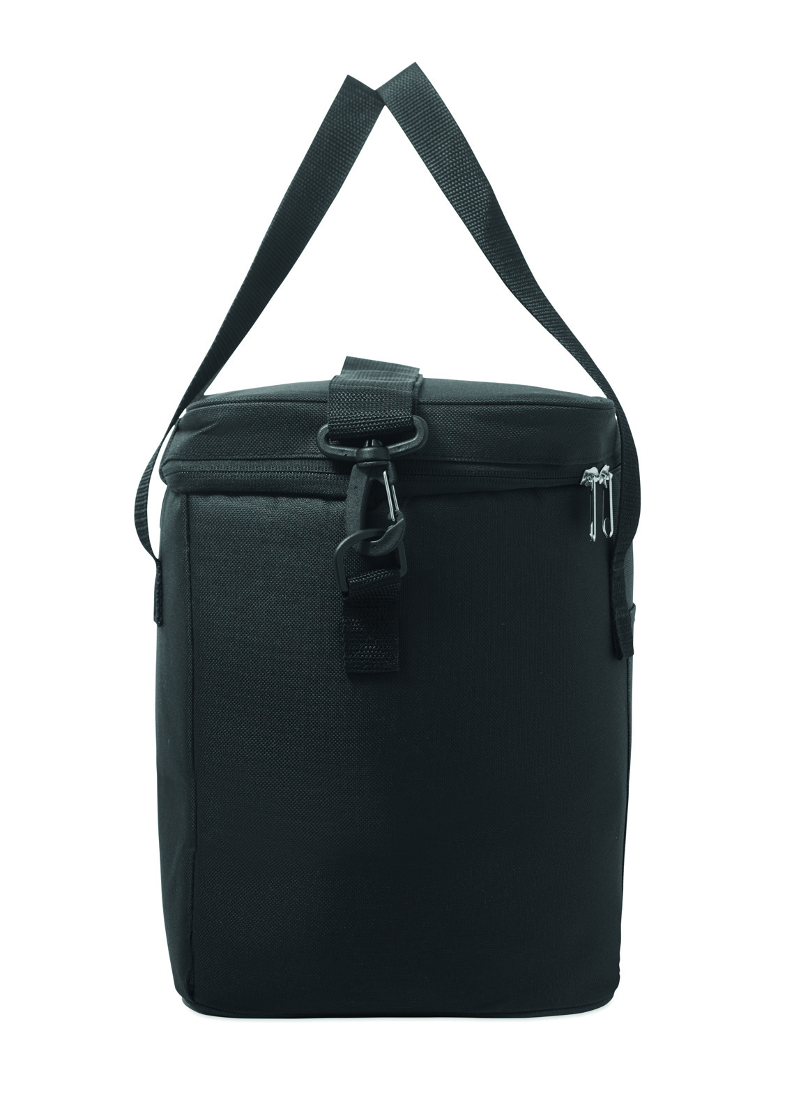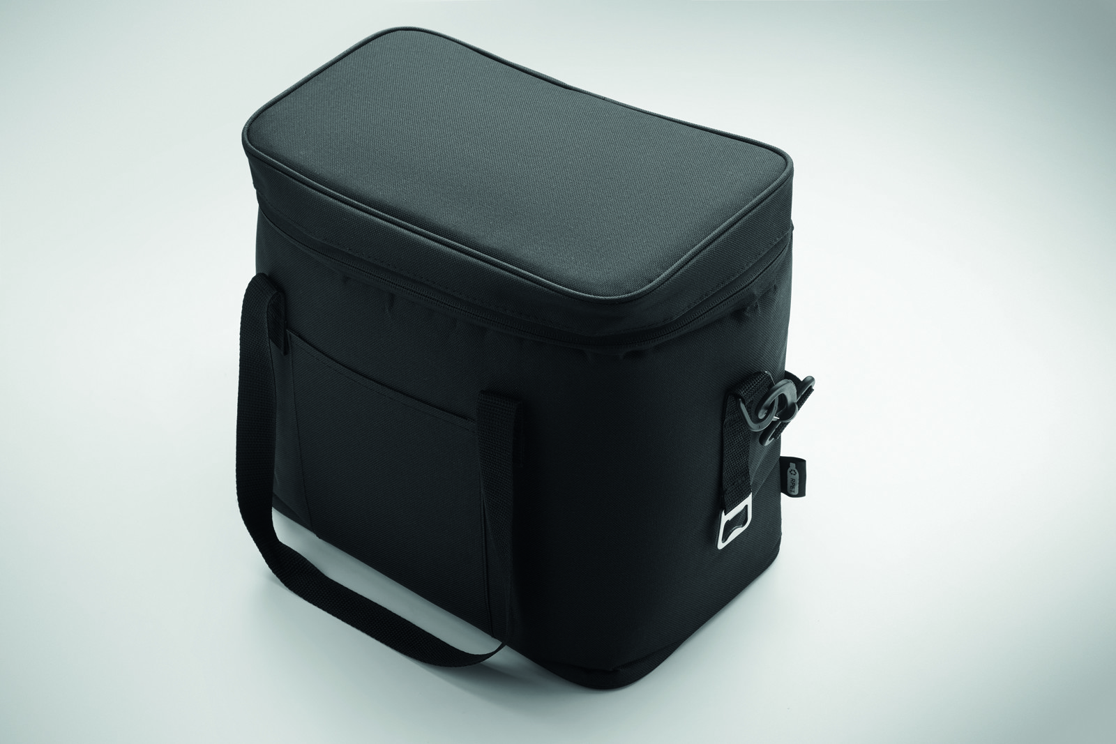 Cooler bag in 600D RPET polyester with PU coating. With 1 front pocket and 1 inner mesh pocket. Isolation PEVA lining with 6mm PE foam. Includes 2 handles and 1 adjustable shoulder strap. Capacity 18L
