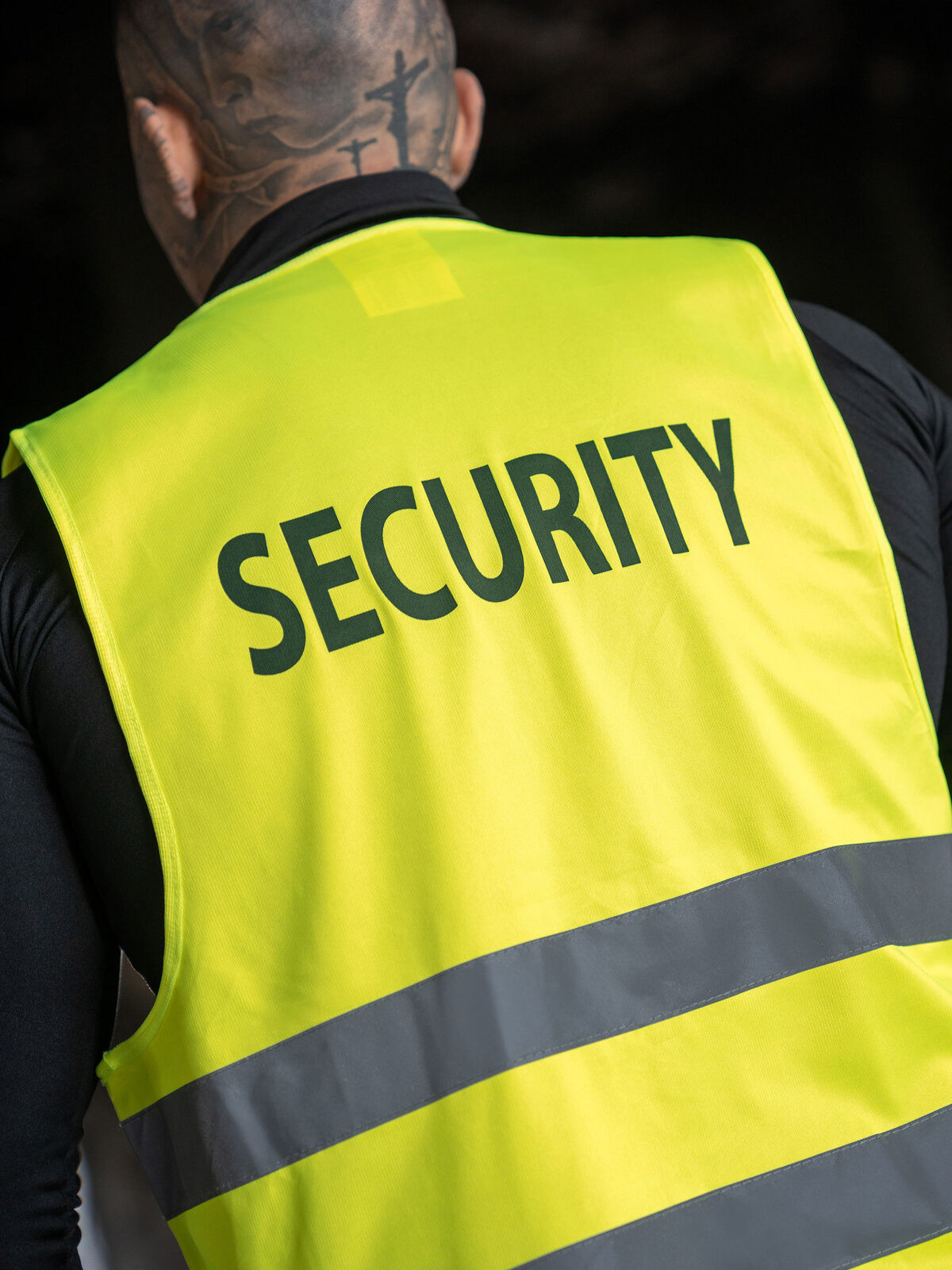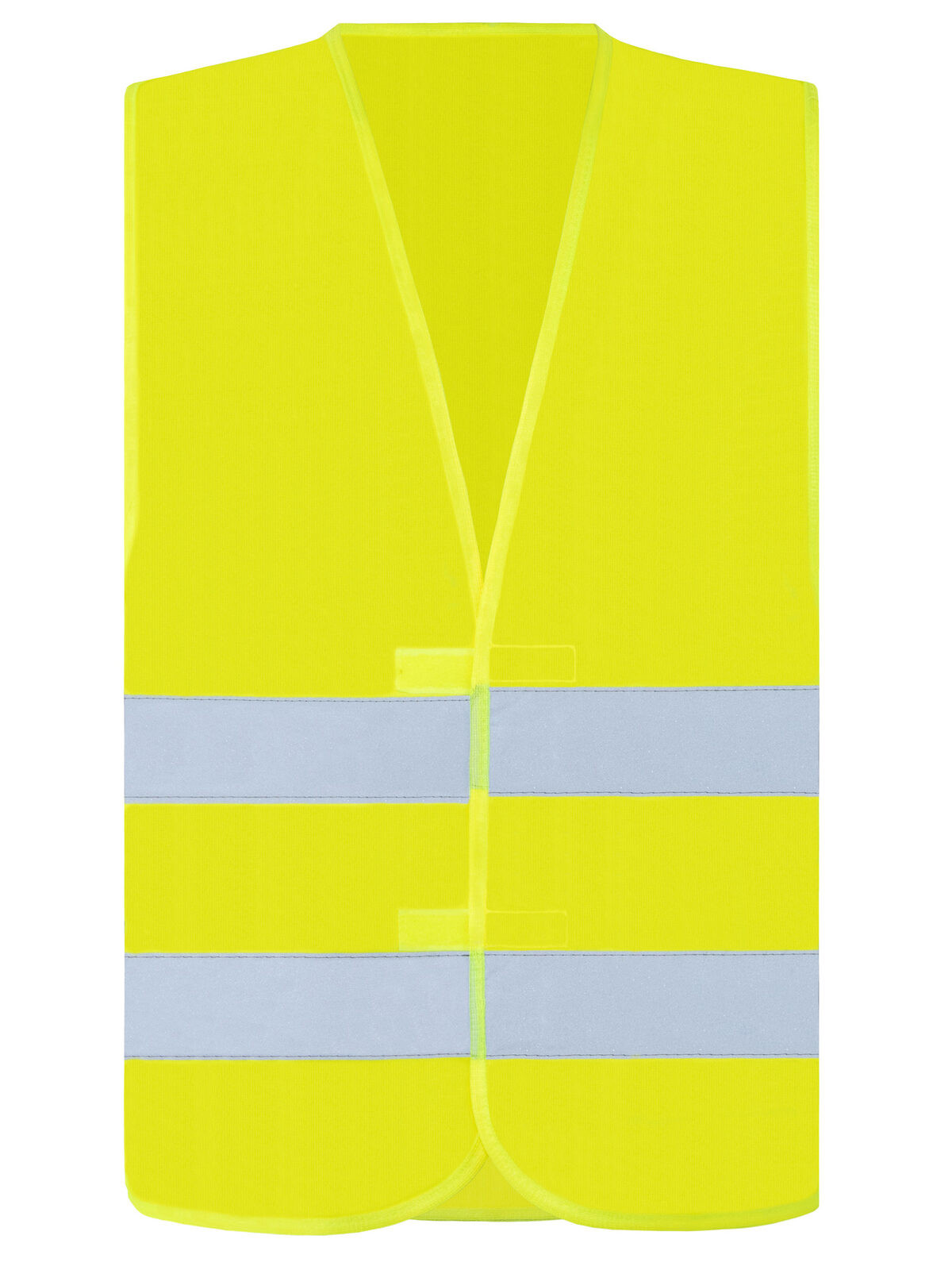 100% polyester. EN ISO 20471:2013/A1:2016, with print "Security", two 5 cm wide reflective strips around the body, adjustable in size with two Velcro fasteners, the manufacturer guarantees the reflective properties according to the EN standard for 25 wash cycles at 40°C, EAN/barcode can be scanned in the label, individually packed.